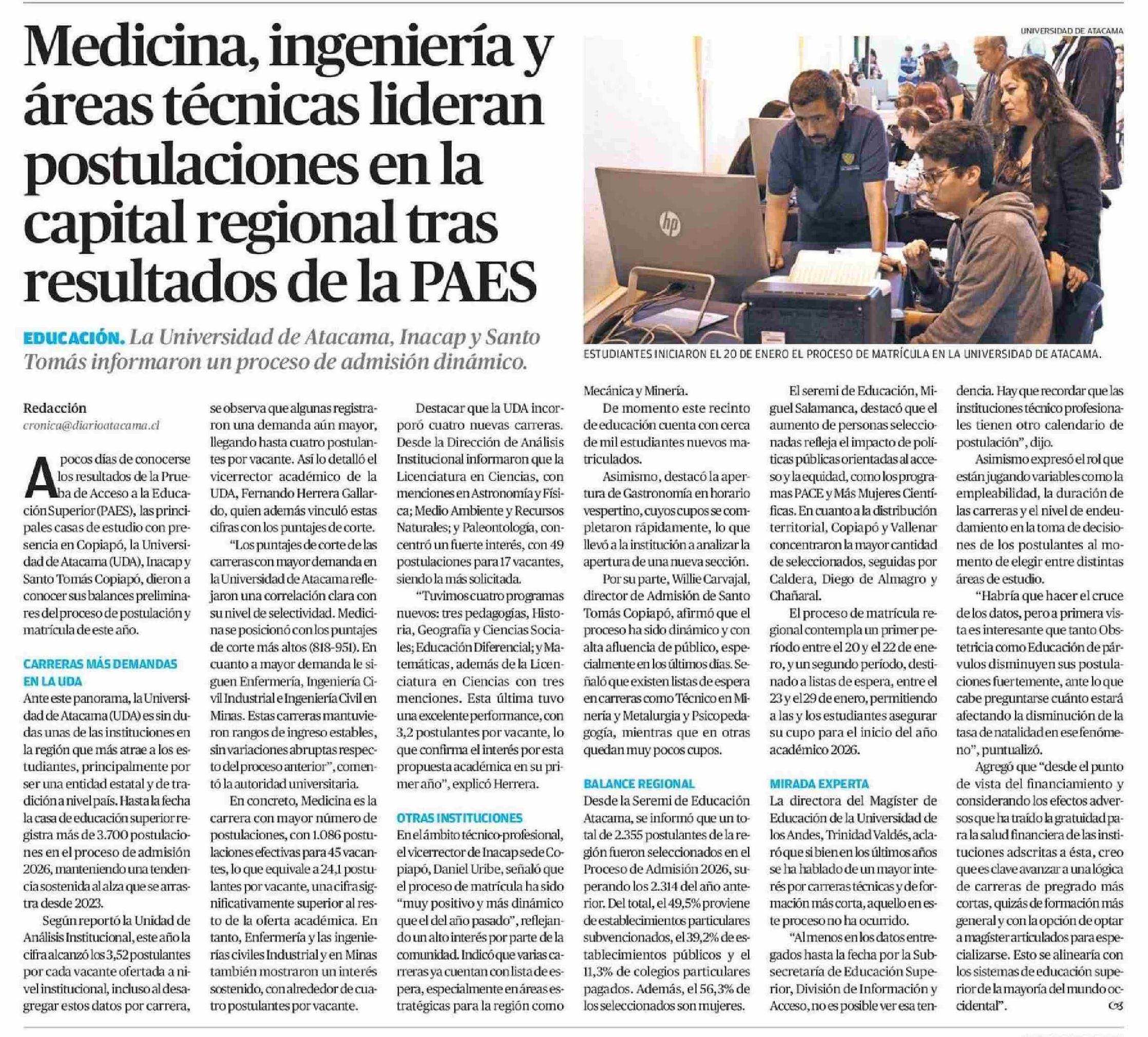 Medicina, ingeniería y áreas técnicas lideran postulaciones en la capital regional tras resultados de la PAES
