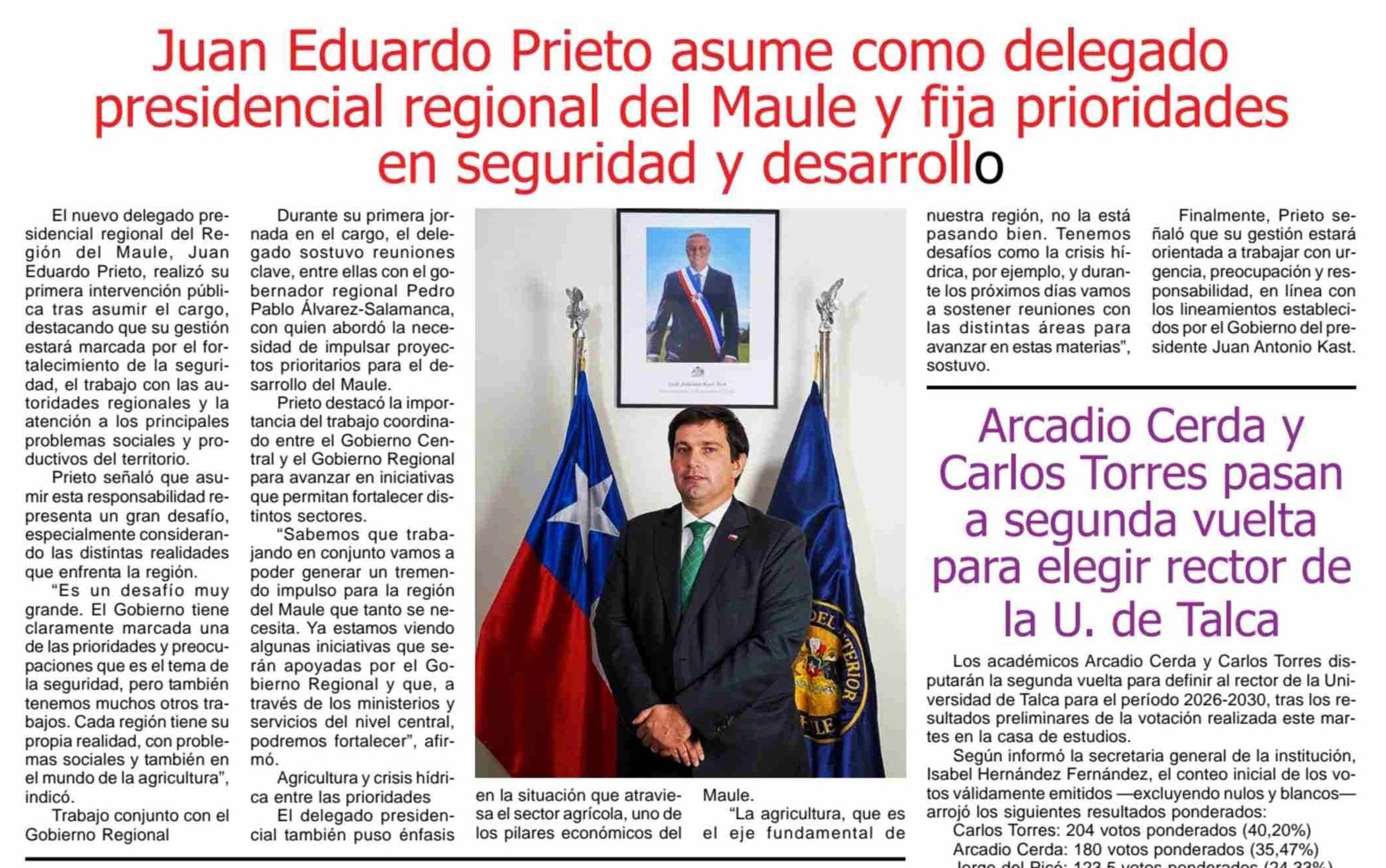 Juan Eduardo Prieto asume como delegado presidencial regional del Maule y fija prioridades en seguridad y desarrollo