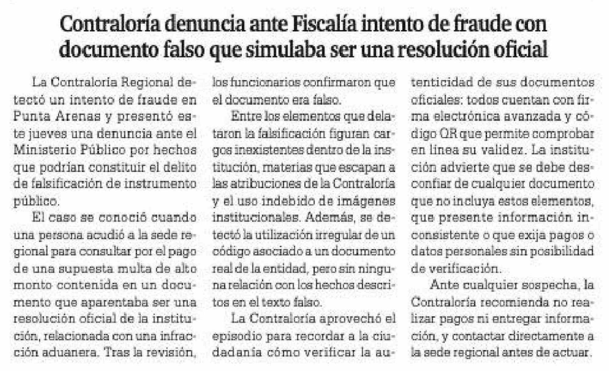 Contraloría denuncia ante Fiscalía intento de fraude con documento falso que simulaba ser una resolución oficial