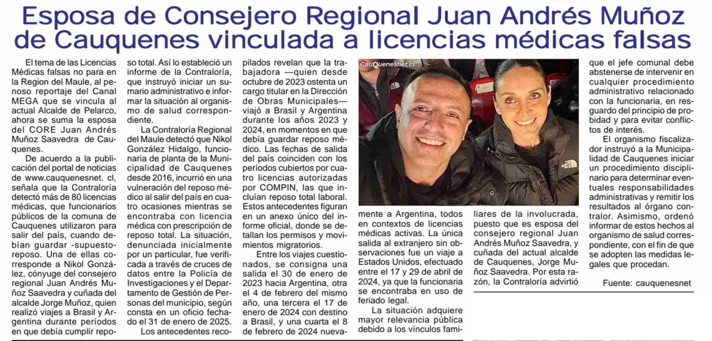 Esposa de Consejero Regional Juan Andrés Muñoz de Cauquenes vinculada a licencias médicas falsas