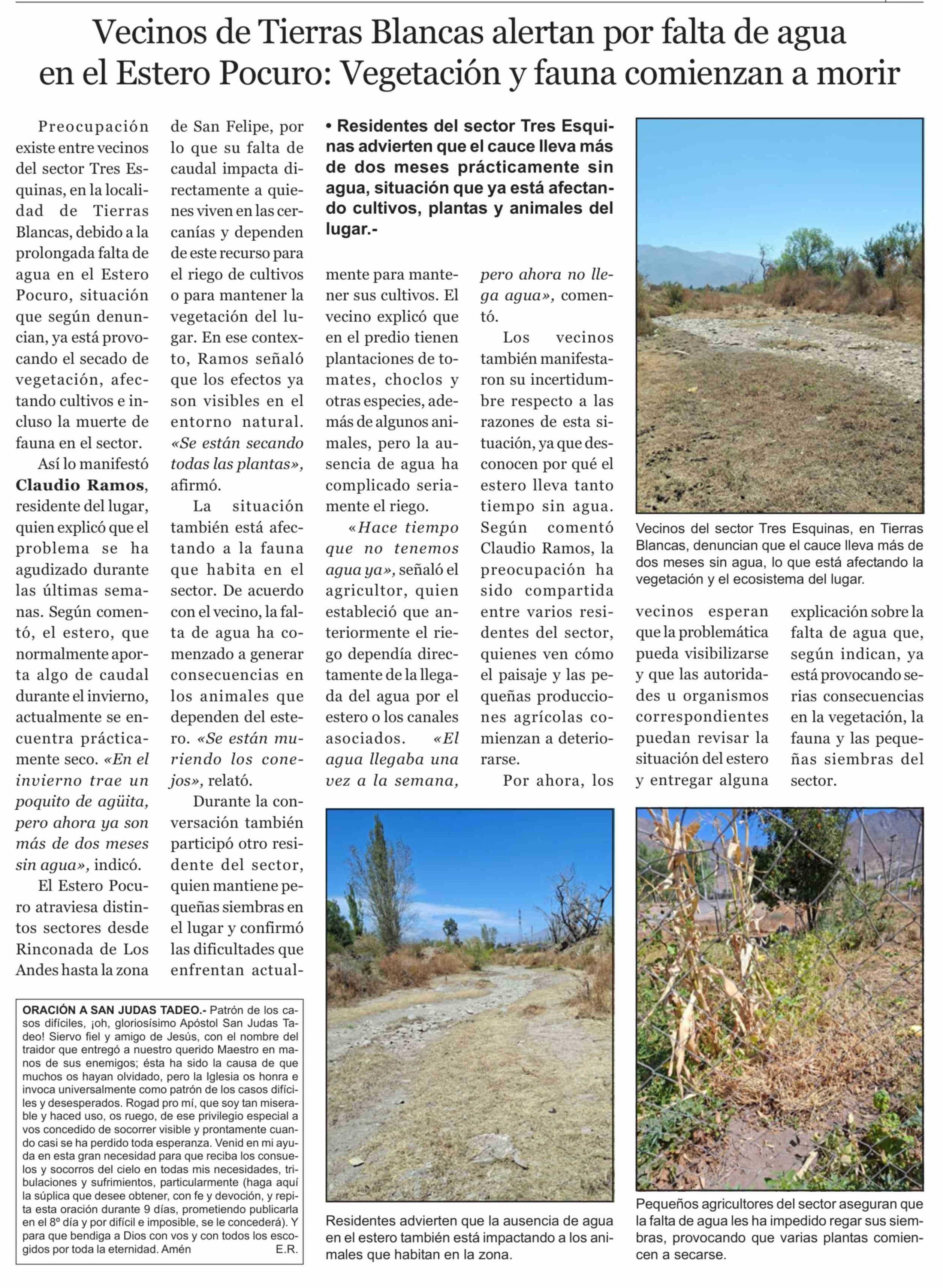 Vecinos de Tierras Blancas alertan por falta de agua en el Estero Pocuro: Vegetación y fauna comienzan a morir
