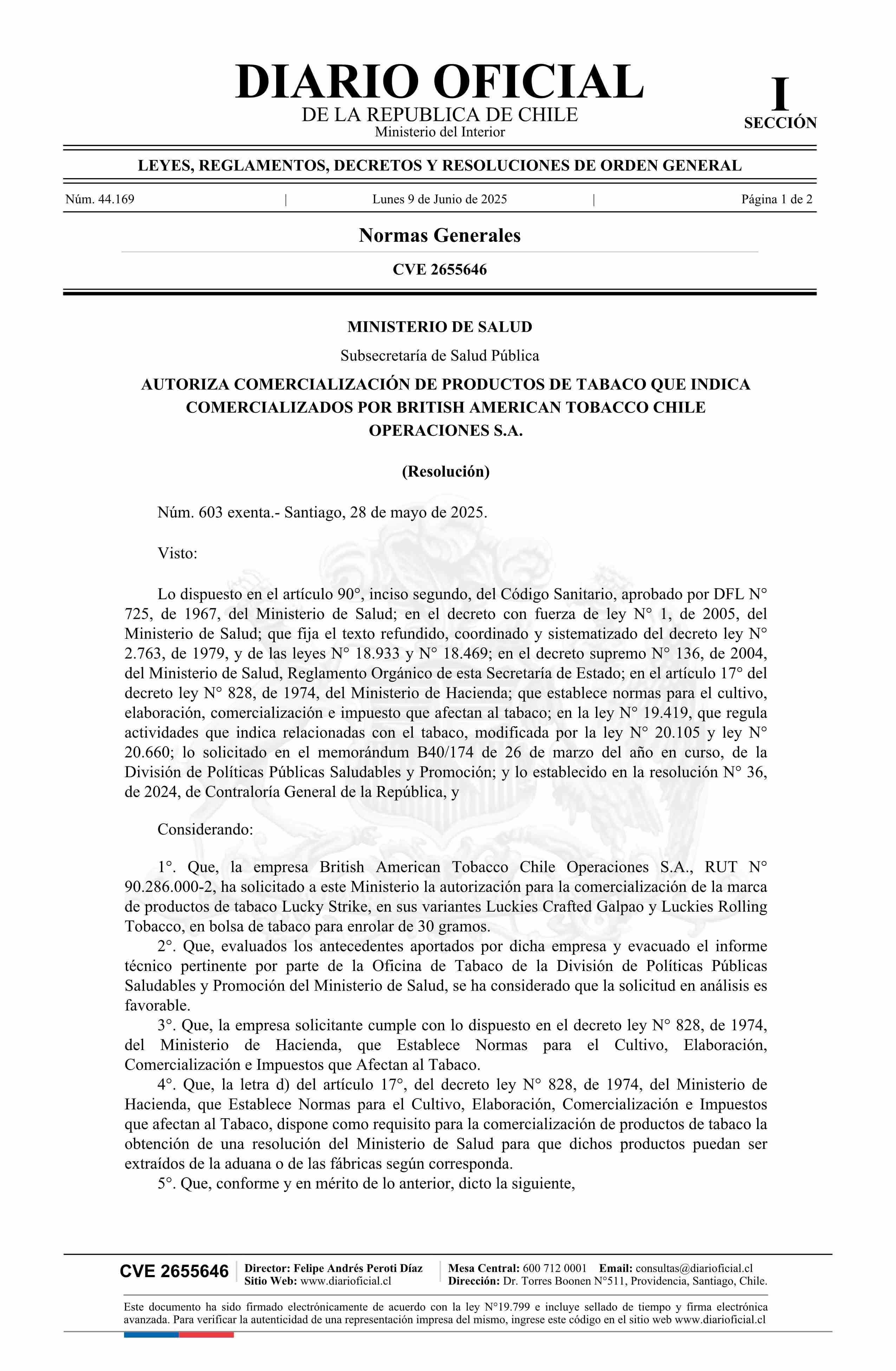 | Título: | Resolución exenta número 603, de 2025.- Autoriza comercialización de productos de tabaco que indica comercializados por British American Tobacco Chile Operaciones S.A. |