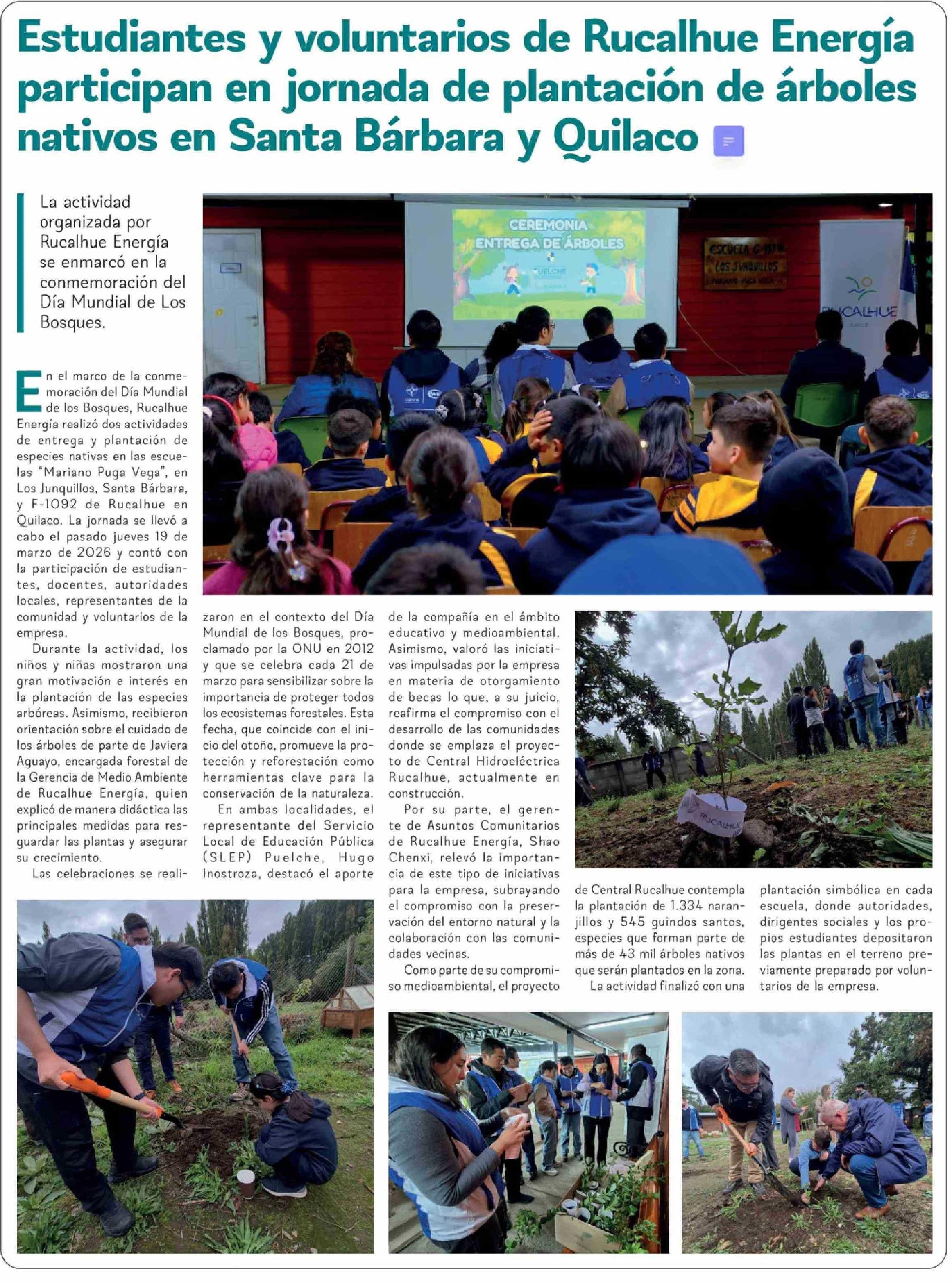 Estudiantes y voluntarios de Rucalhue Energía participan en jornada de plantación de árboles nativos en Santa Bárbara y Quilaco