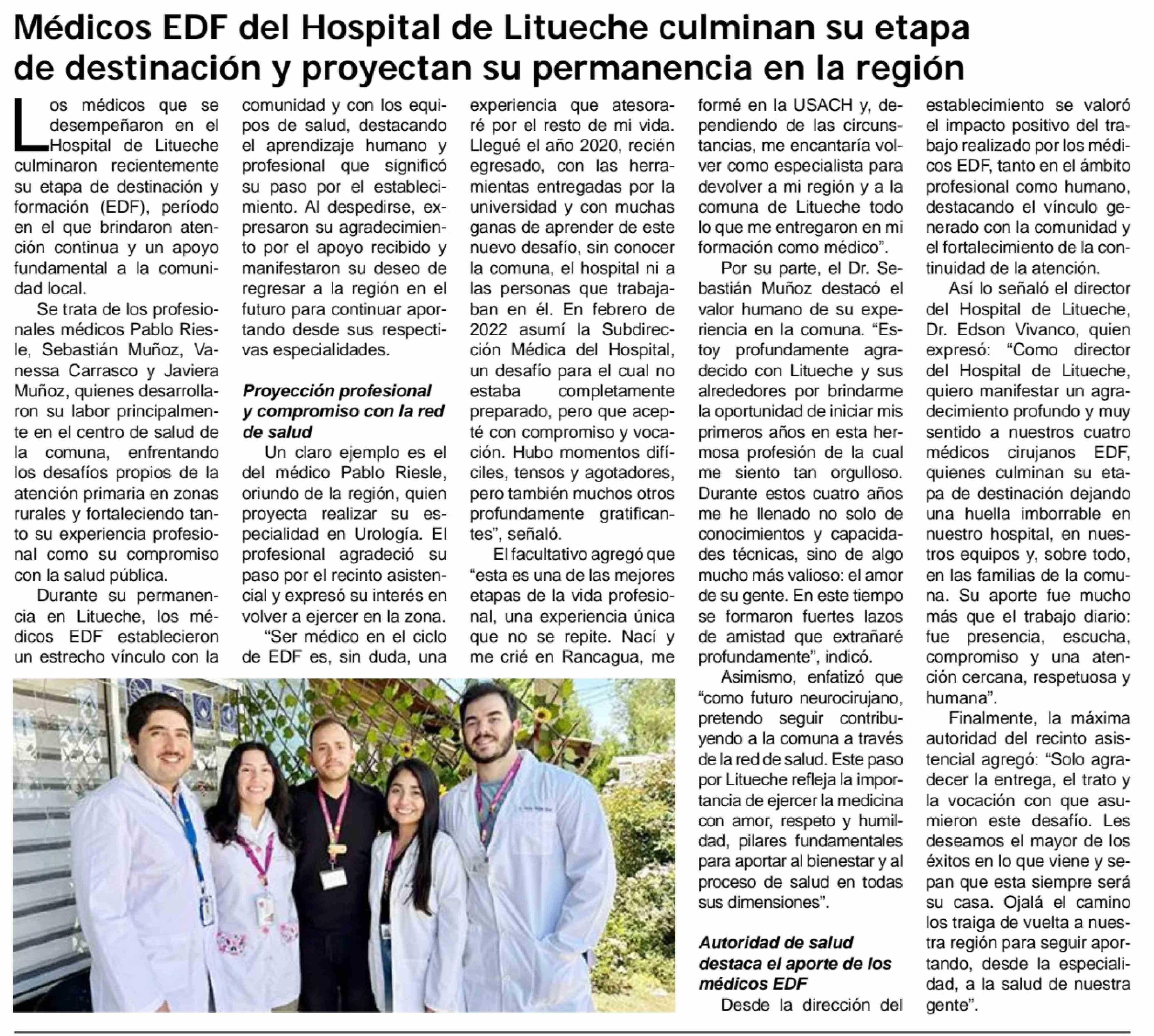 Médicos EDF del Hospital de Litueche culminan su etapa de destinación y proyectan su permanencia en la región