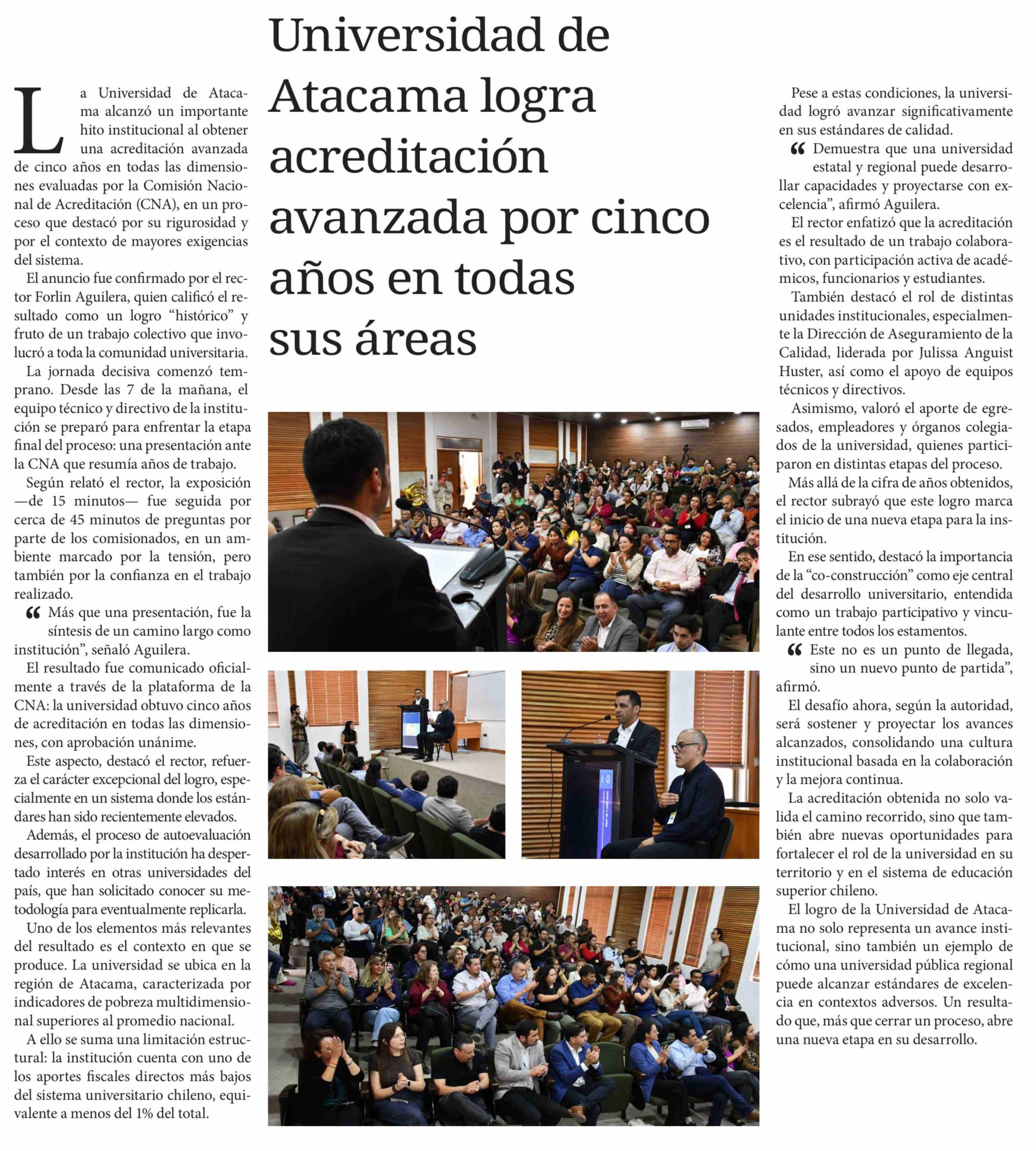 Universidad de Atacama logra acreditación avanzada por cinco años en todas sus áreas