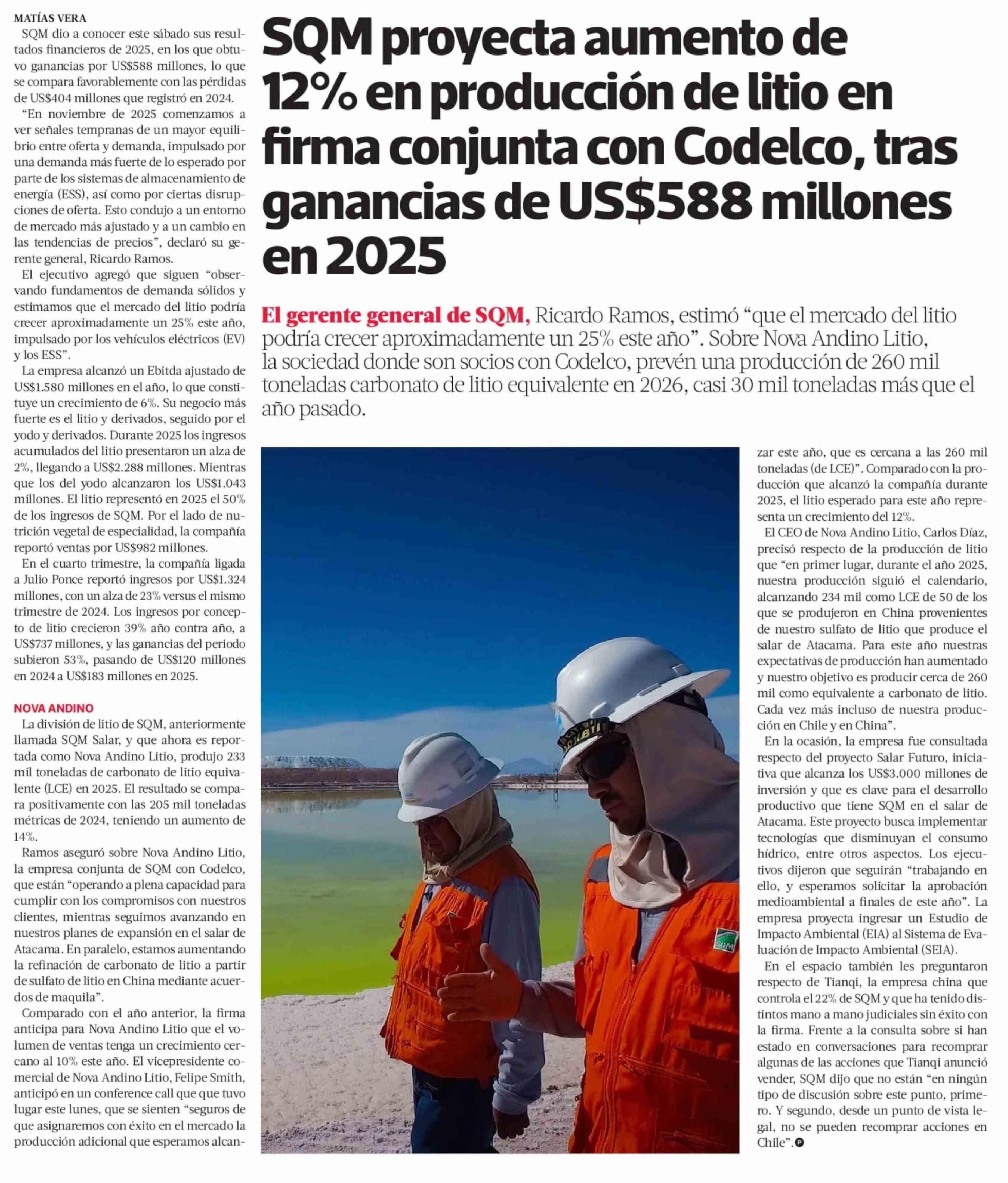 SQM proyecta aumento de 12% en producción de litio en firma conjunta con Codelco, tras ganancias de US$588 millones en 2025