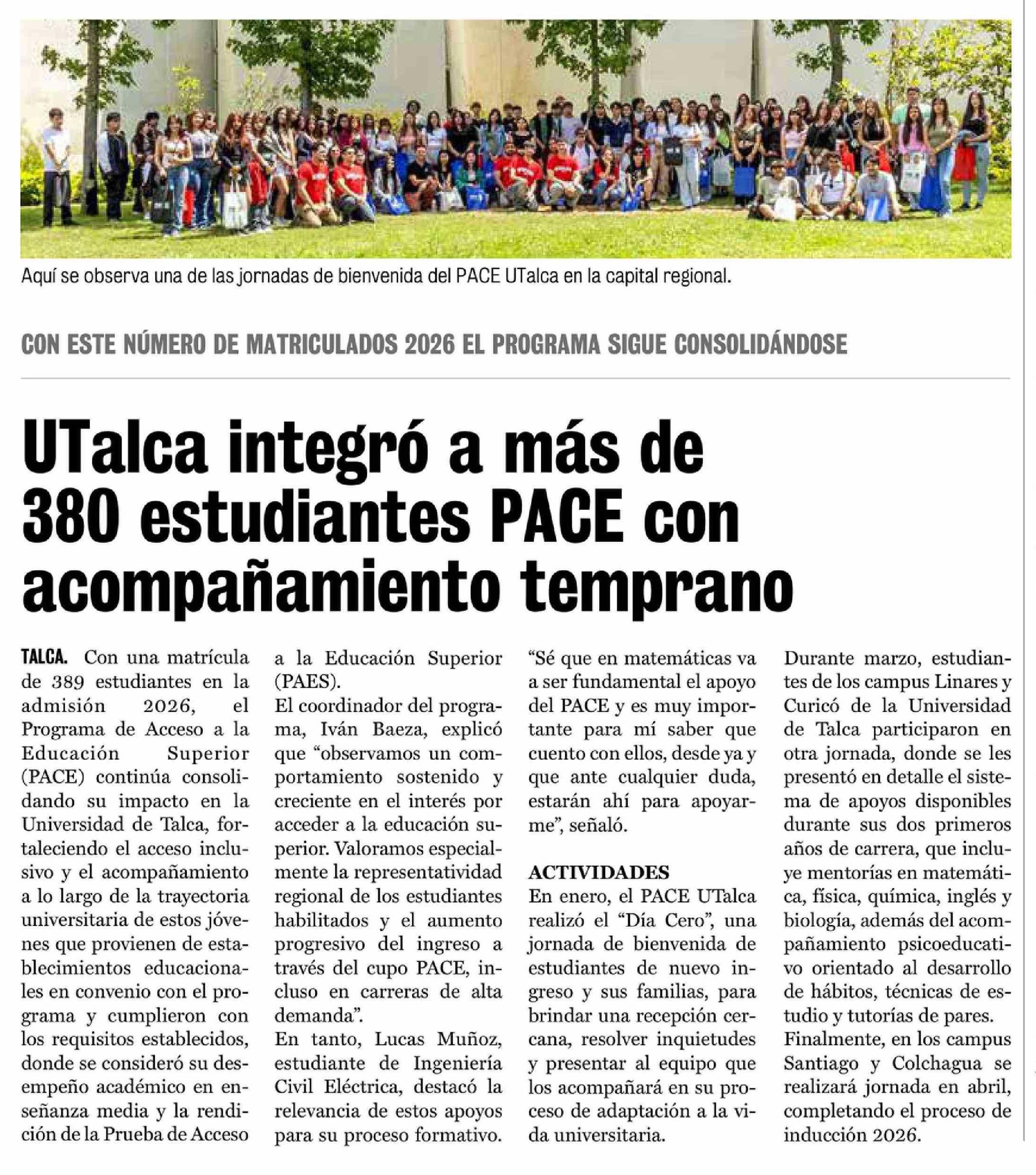 UTalca integró a más de 380 estudiantes PACE con acompañamiento temprano