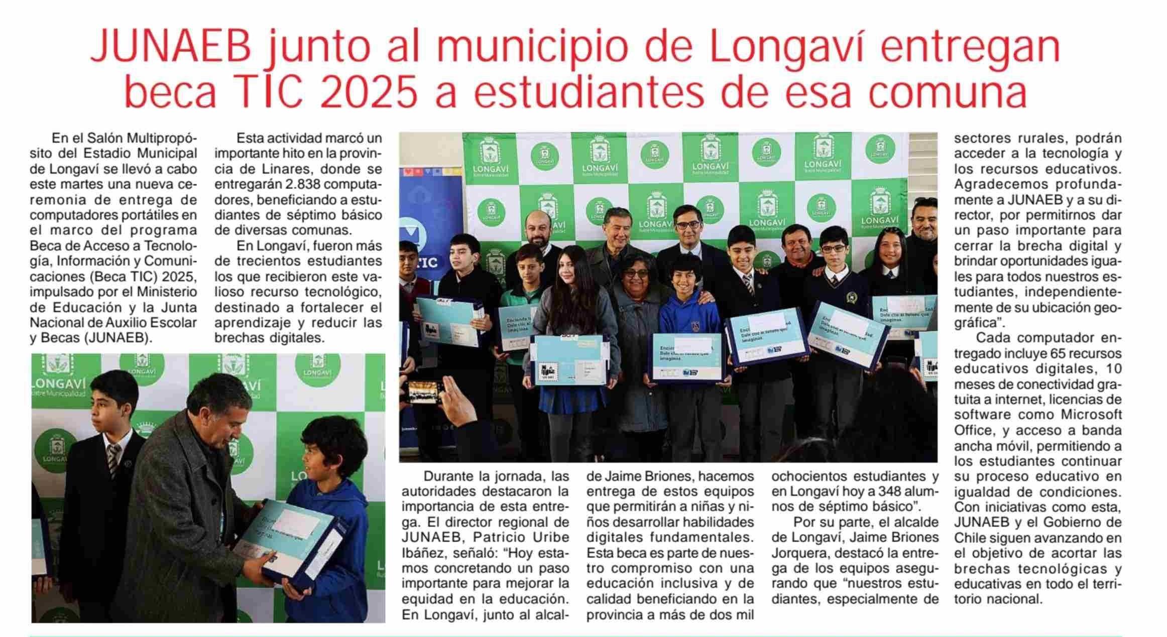 Título: JUNAEB junto al municipio de Longaví entregan beca TIC 2025 a estudiantes de esa comuna