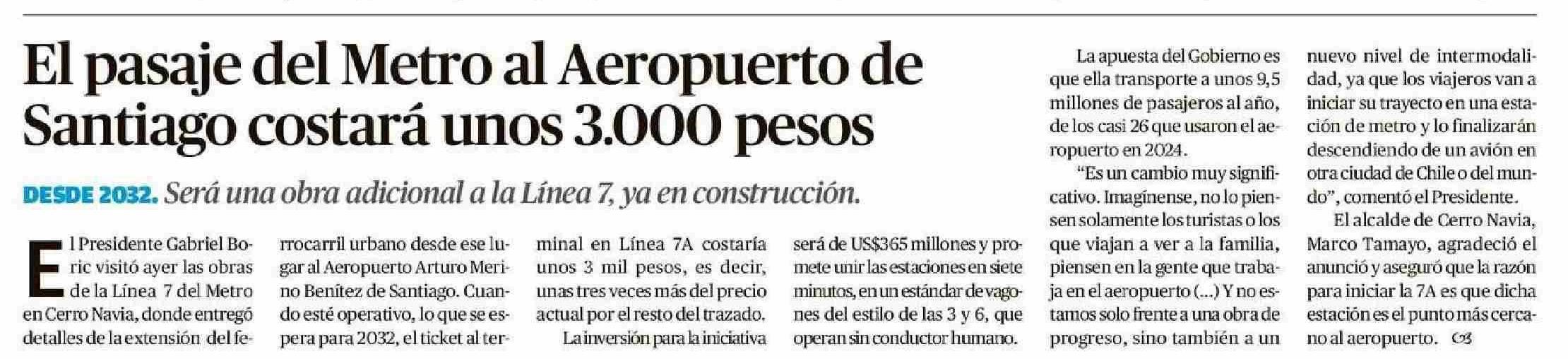El pasaje del Metro al Aeropuerto de Santiago costará unos 3.000 pesos