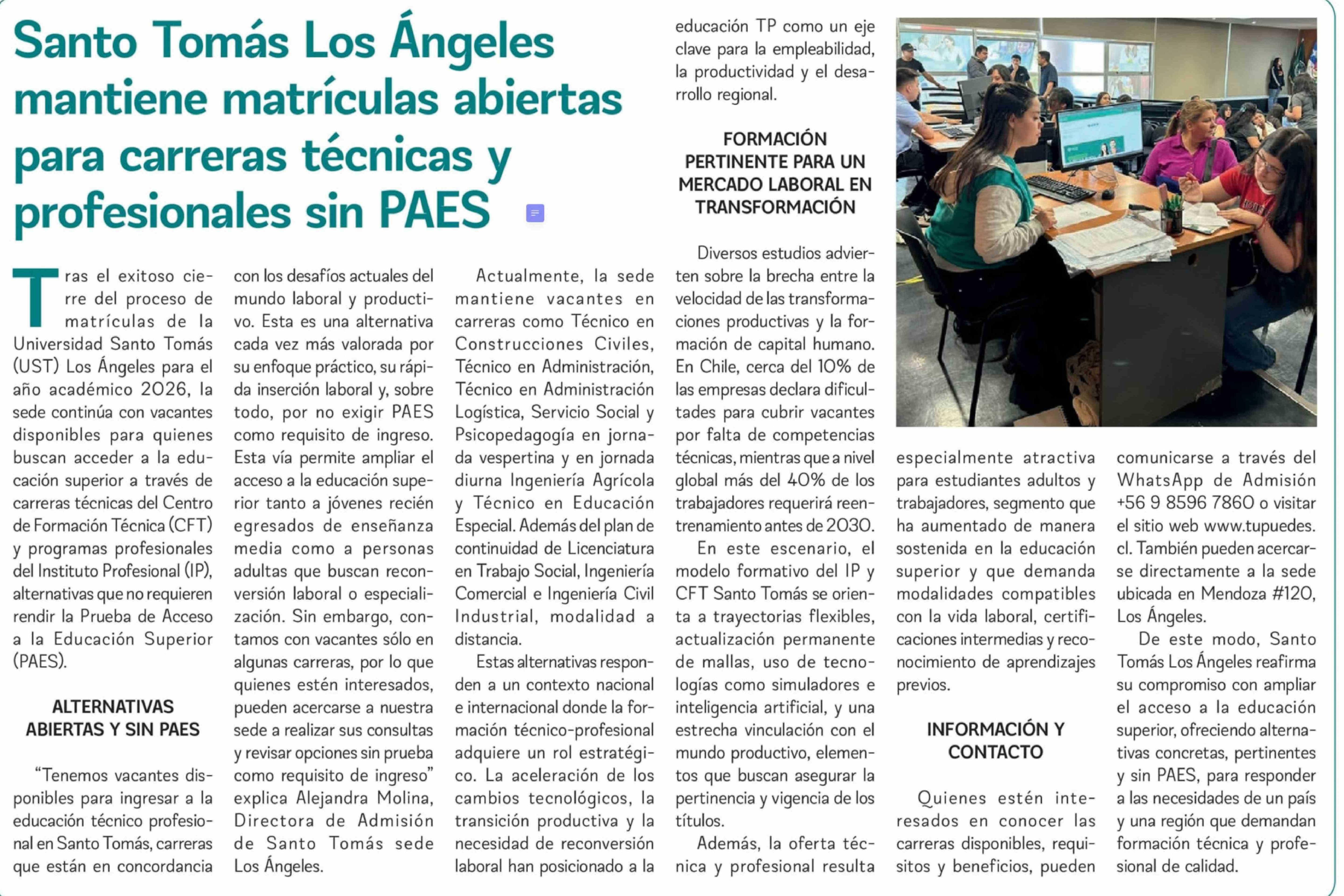 Santo Tomás Los Ángeles mantiene matrículas abiertas para carreras técnicas y profesionales sin PAES
