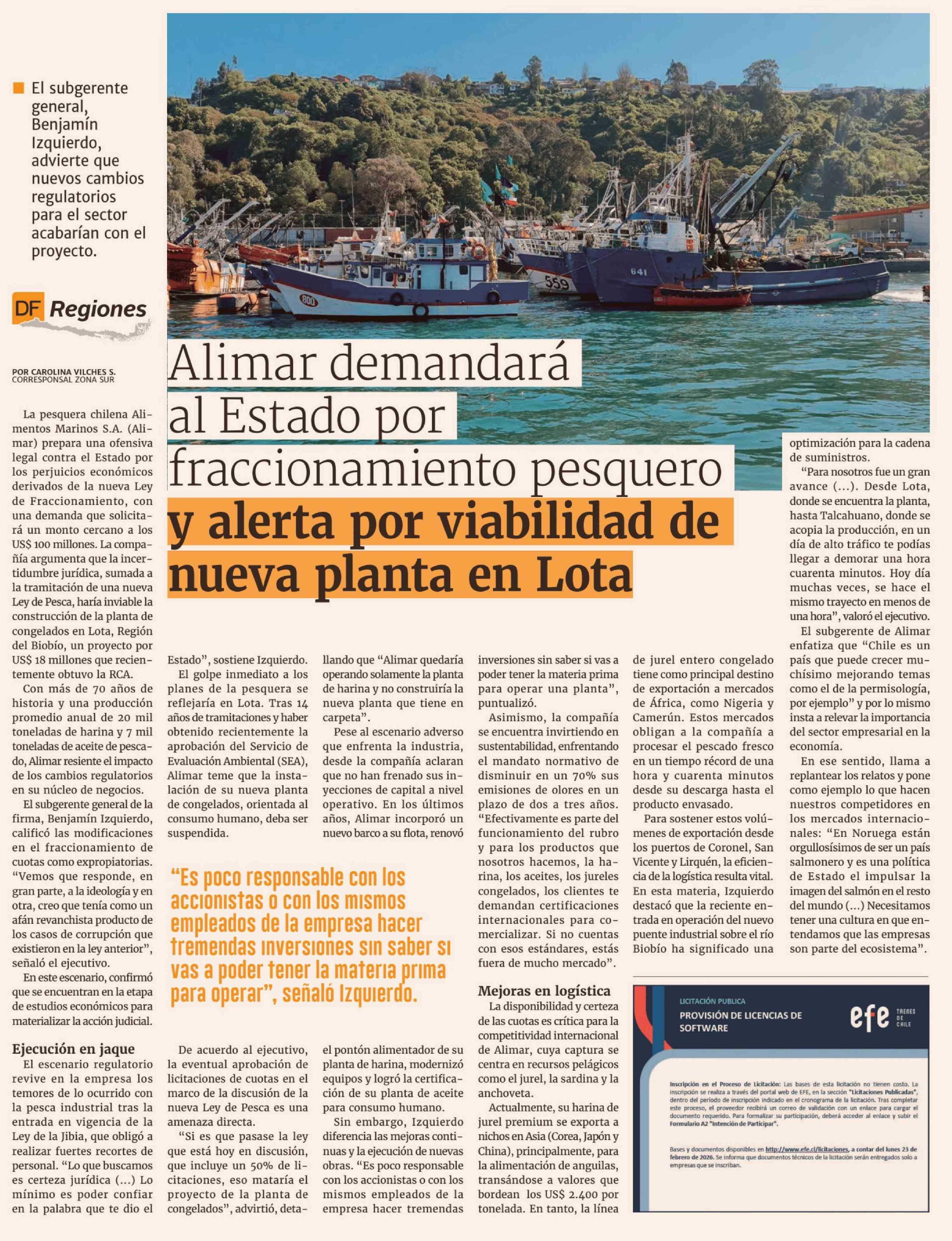 Alimar demandará al Estado por fraccionamiento pesquero y alerta por viabilidad de nueva planta en Lota