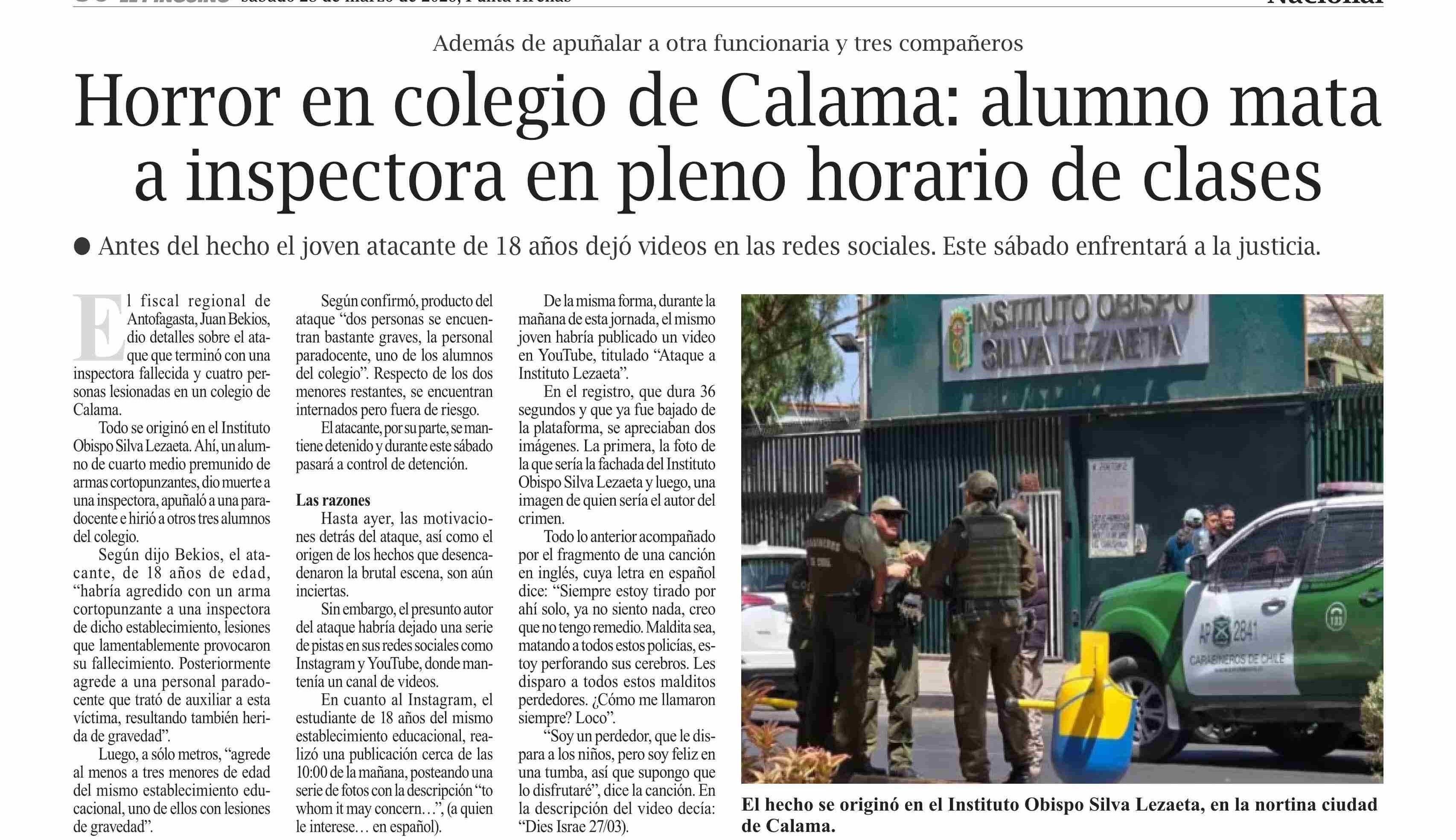 Horror en colegio de Calama: alumno mata a inspectora en pleno horario de clases