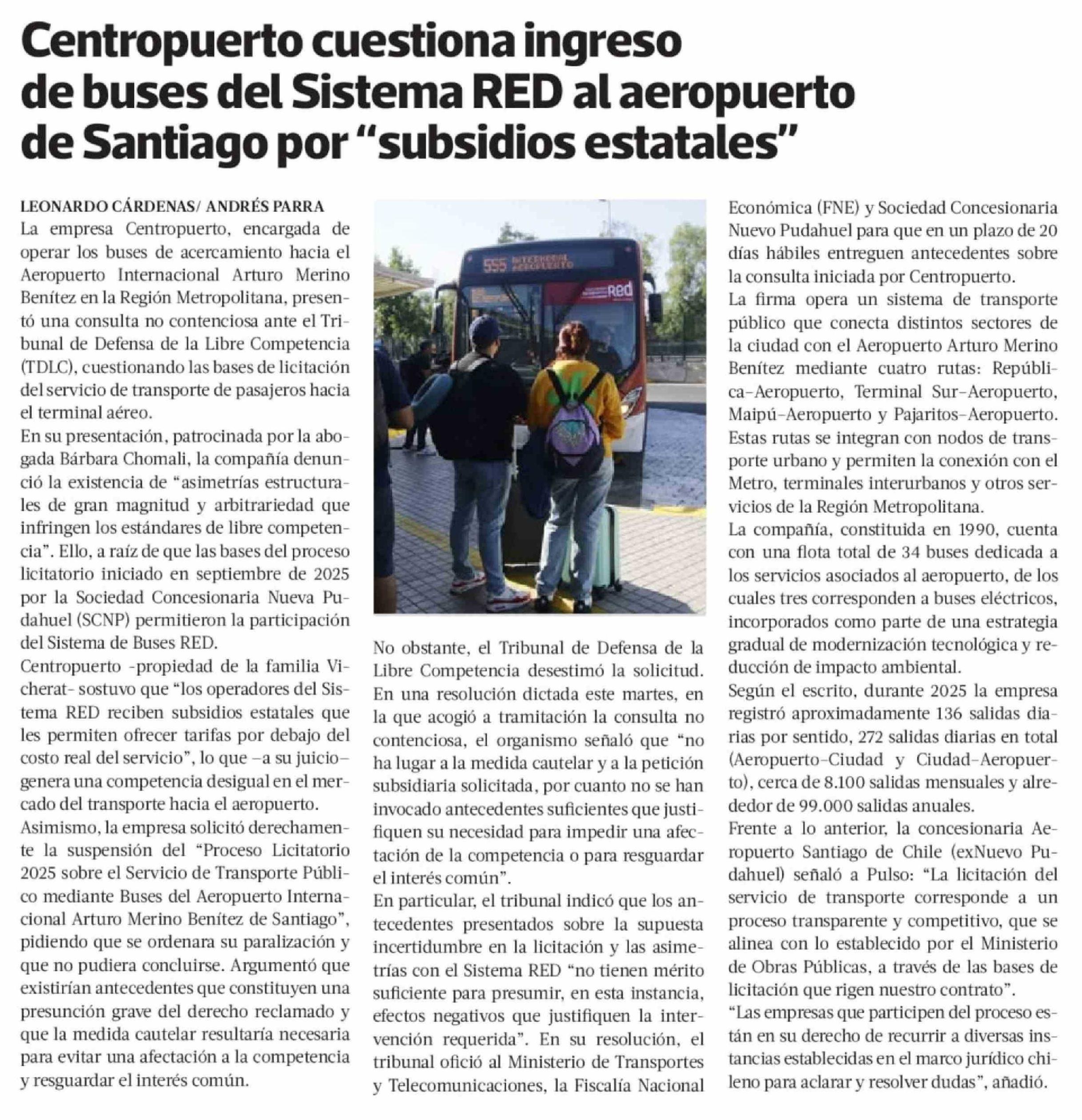 Centropuerto cuestiona ingreso de buses del Sistema RED al aeropuerto de Santiago por "subsidios estatales"