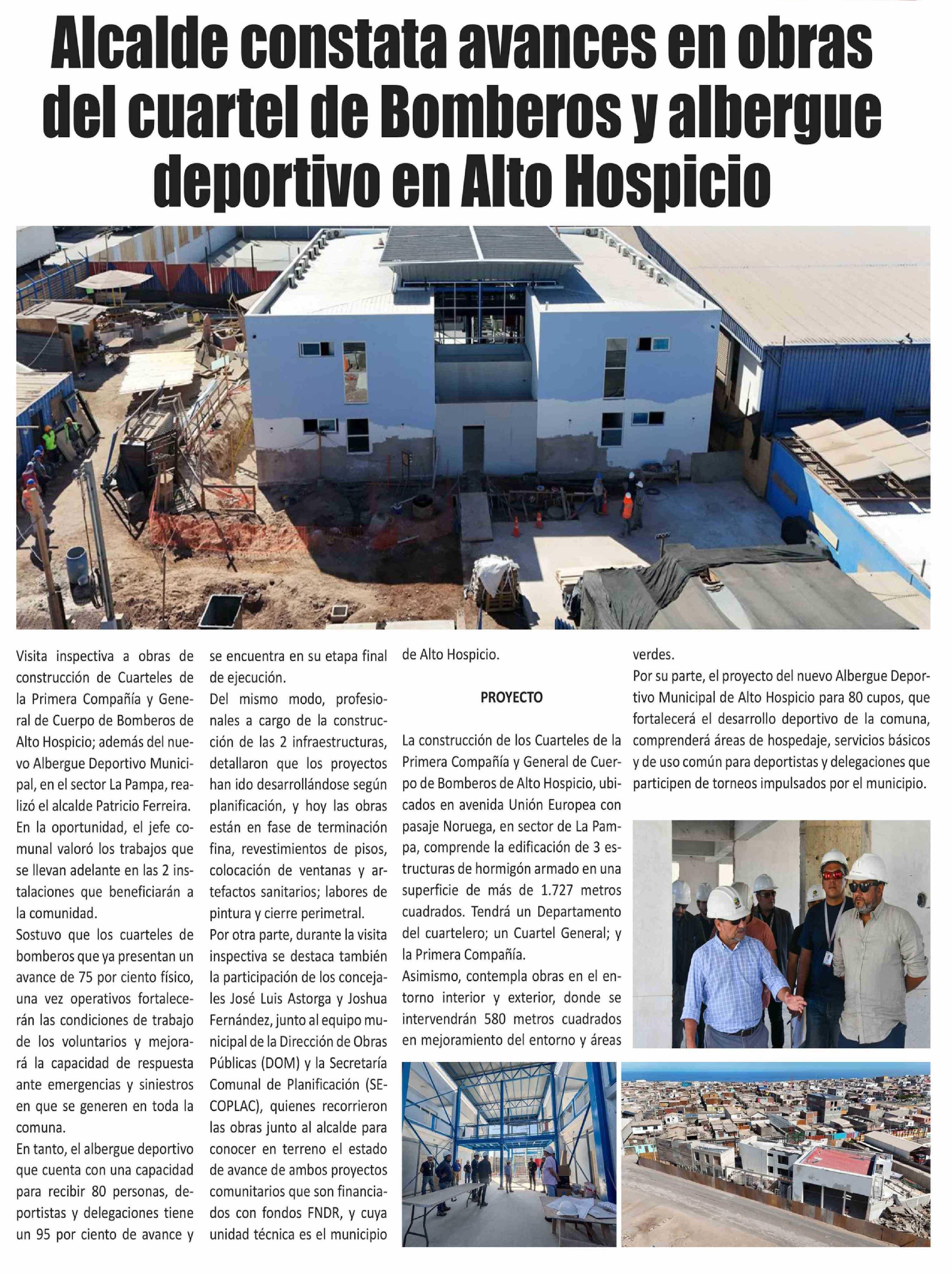 Alcalde constata avances en obras del cuartel de Bomberos y albergue deportivo en Alto Hospicio
