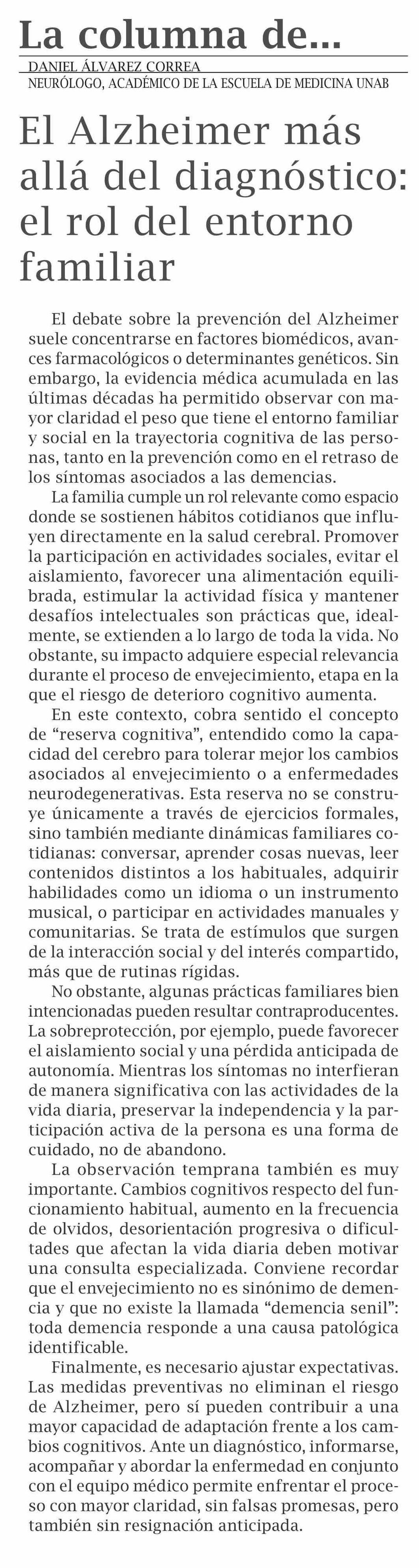 Columnas de Opinión: El Alzheimer más allá del diagnóstico: el rol del entorno familiar