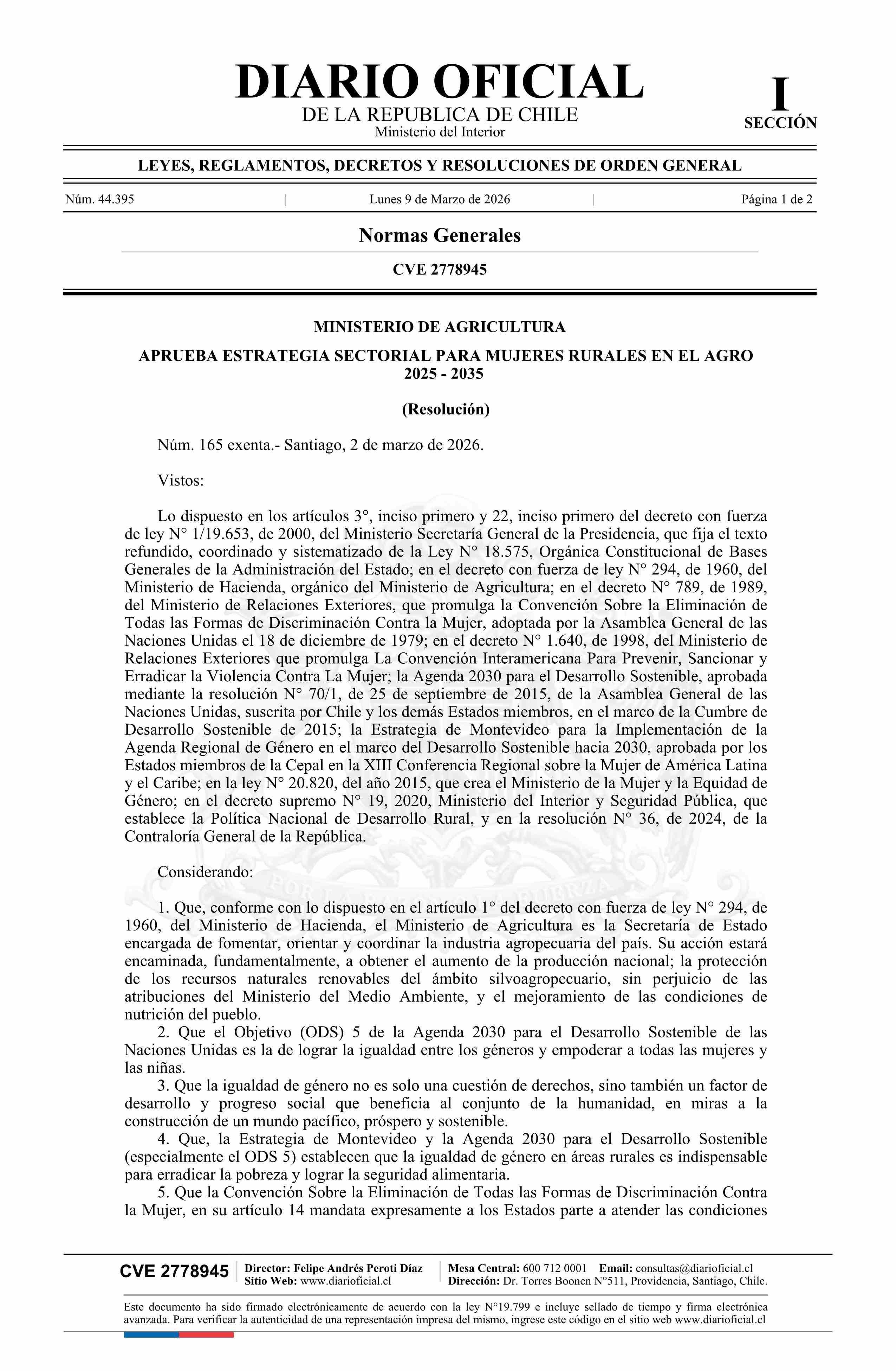 | Título: | Resolución exenta número 165, de 2026.- Aprueba estrategia sectorial para mujeres rurales en el agro 2025 - 2035 |