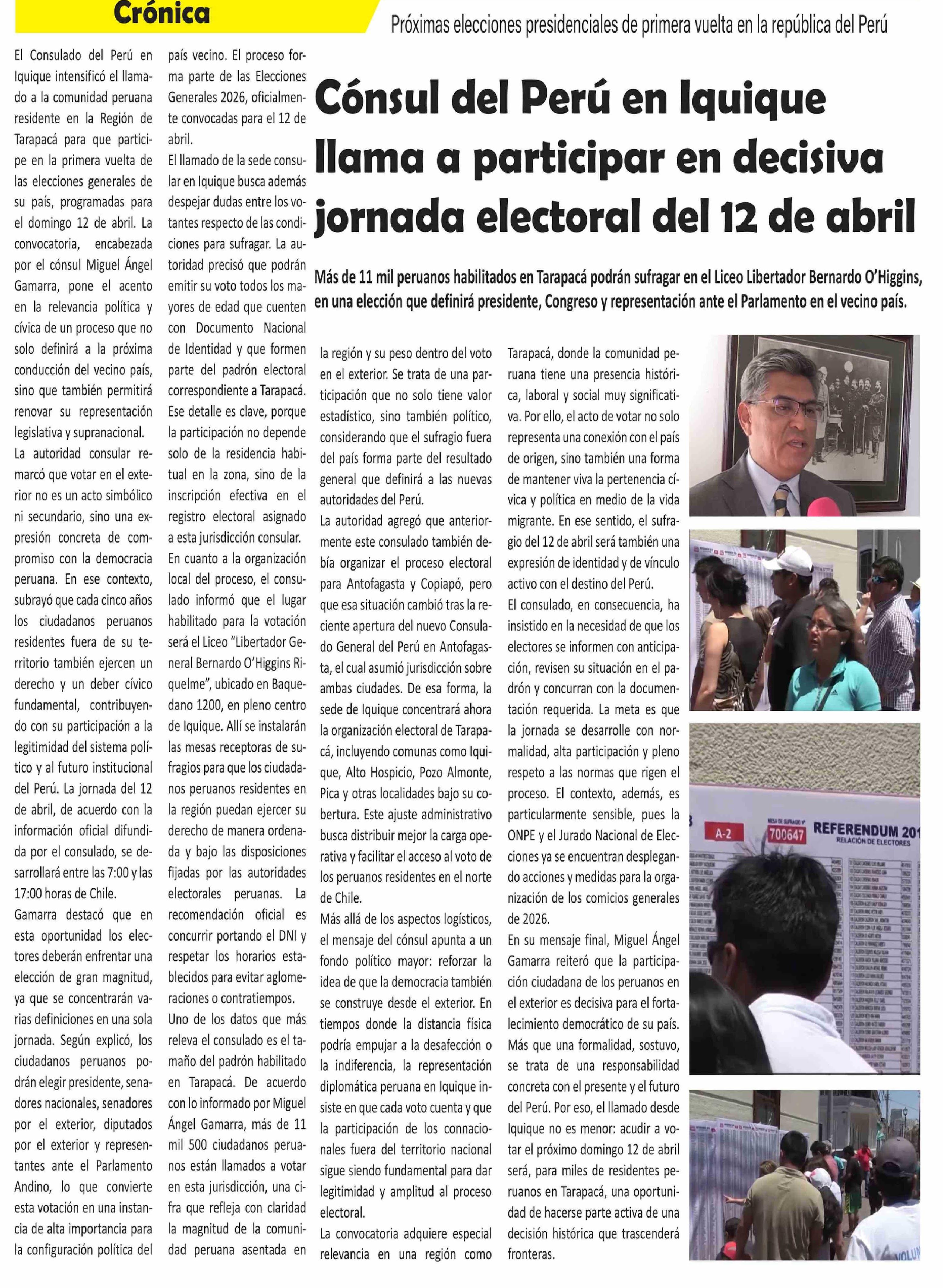 Cónsul del Perú en Iquique llama a participar en decisiva jornada electoral del 12 de abril