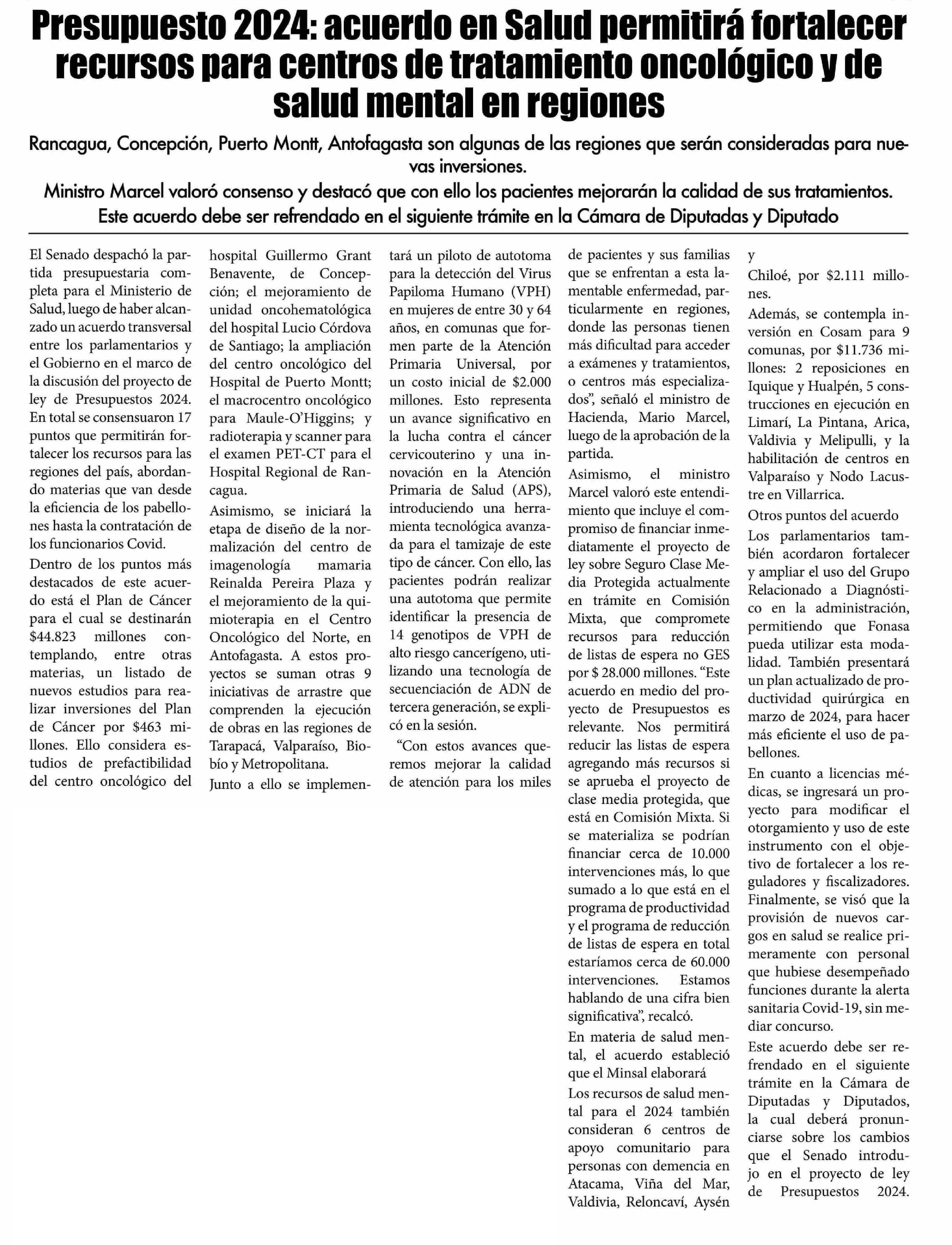 Presupuesto 2024: acuerdo en Salud permitirá fortalecer recursos para centros de tratamiento oncológico y de salud mental en regiones
