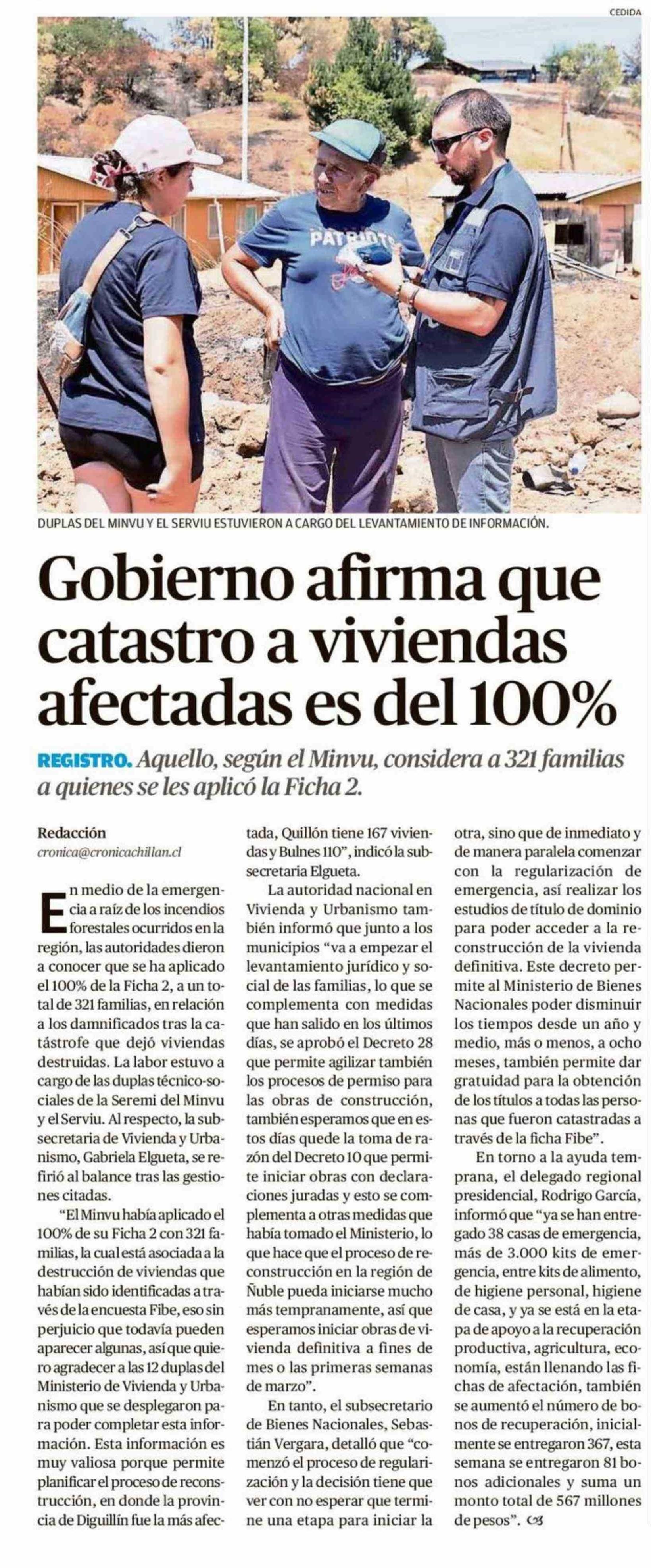 Gobierno afirma que catastro a viviendas afectadas es del 100%