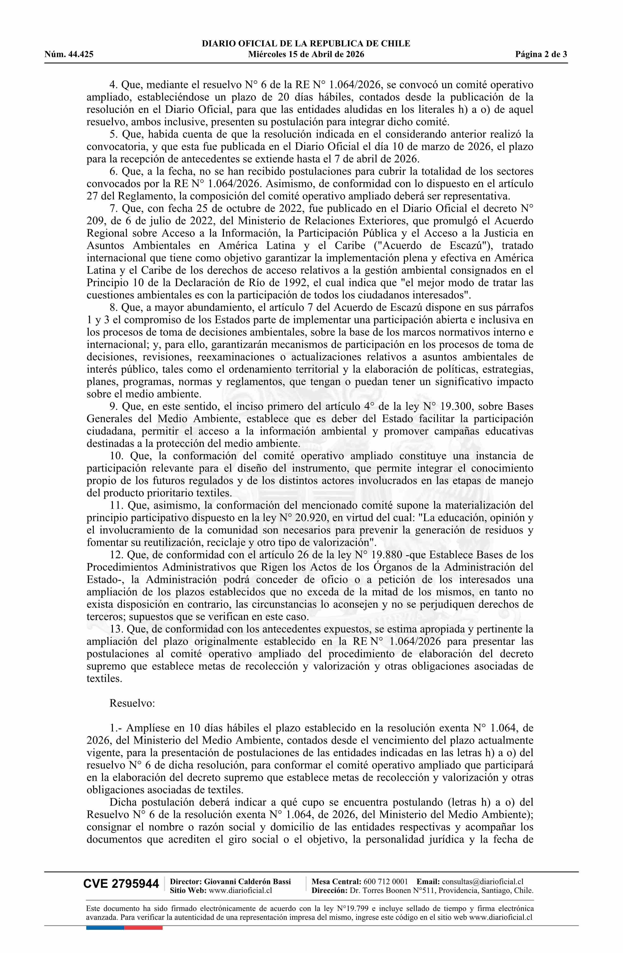Título: Resolución exenta número 1.785, de 2026.- Amplía el plazo para presentar las postulaciones para integrar el comité operativo ampliado que participará en la elaboración del decreto supremo que establece metas de recolección y valorización y otras obligaciones asociadas de textiles