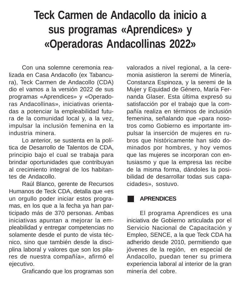 Teck Carmen de Andacollo da inicio a sus programas «Aprendices» y «Operadoras Andacollinas 2022»