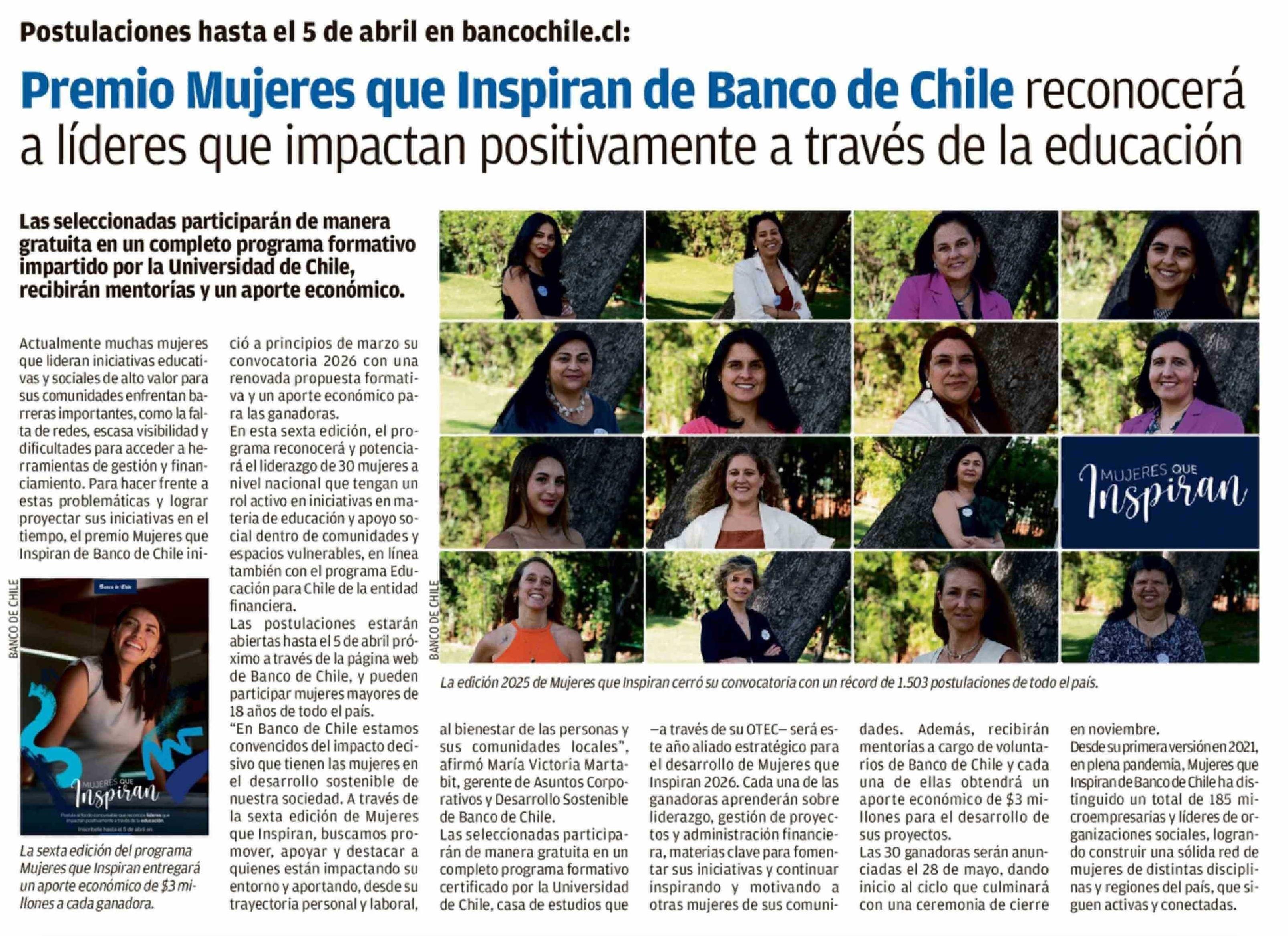 Premio Mujeres que Inspiran de Banco de Chile reconocerá a líderes que impactan positivamente a través de la educación