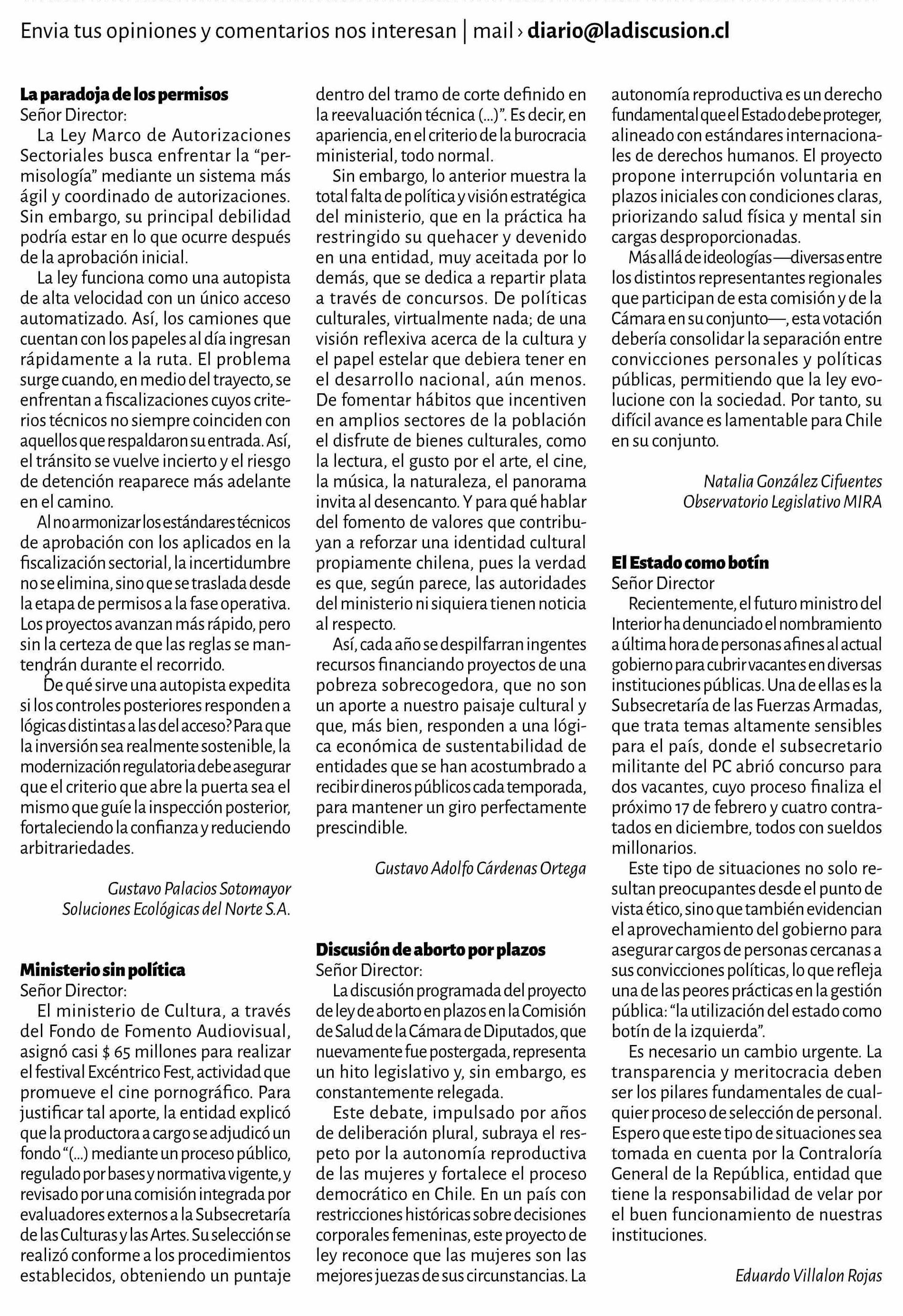 Título: Cartas: La paradoja de los permisos Señor Director: La Ley Marco de Autorizaciones Sectoriales busca enfrentar la "permisología" mediante un sistema más ágil y coordinado de autorizaciones. Sin embargo, su principal debilidad podría estar en lo que ocurre después de la aprobación inicial. La ley fun