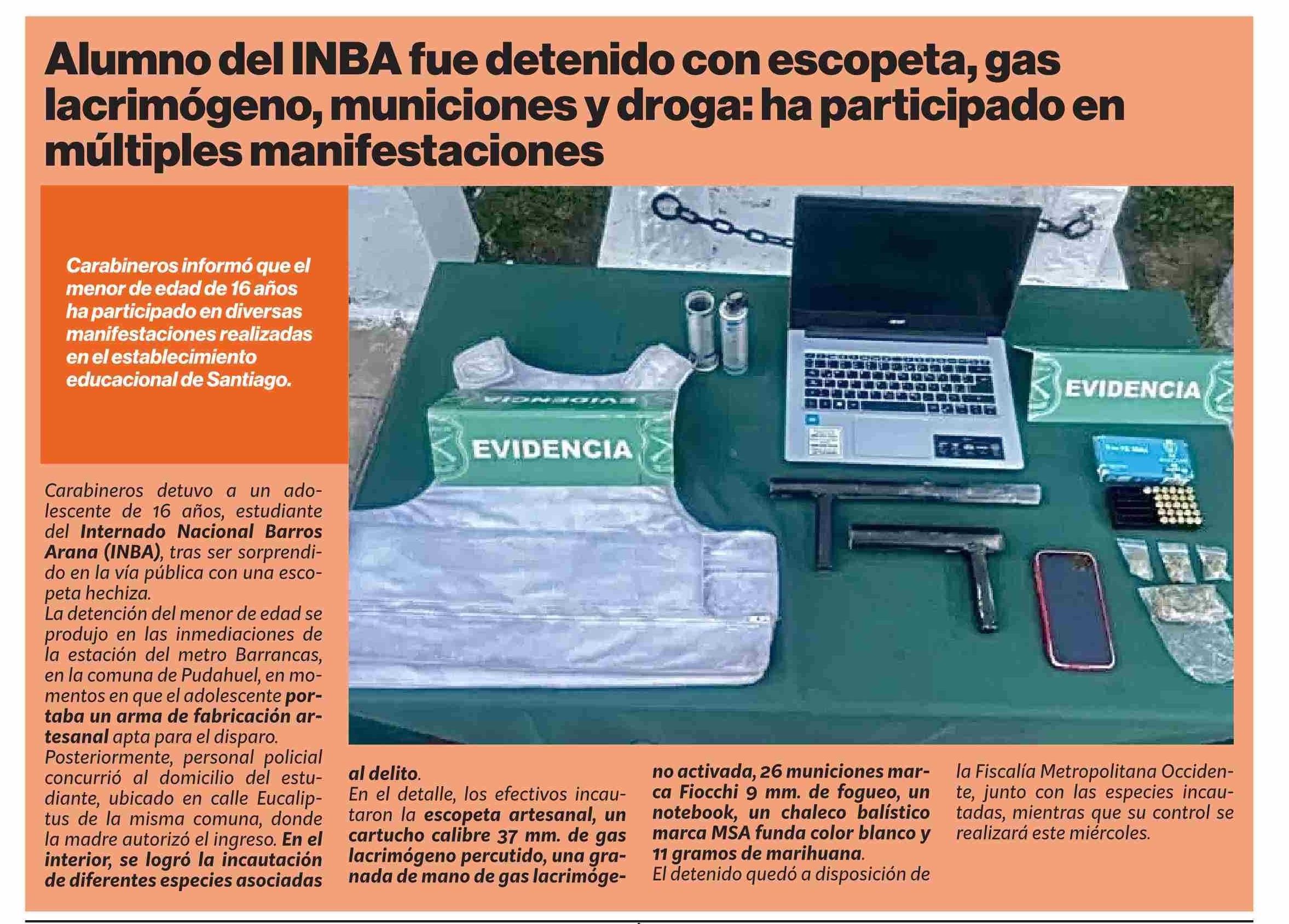 Alumno del INBA fue detenido con escopeta, gas lacrimógeno, municiones y droga: ha participado en múltiples manifestaciones