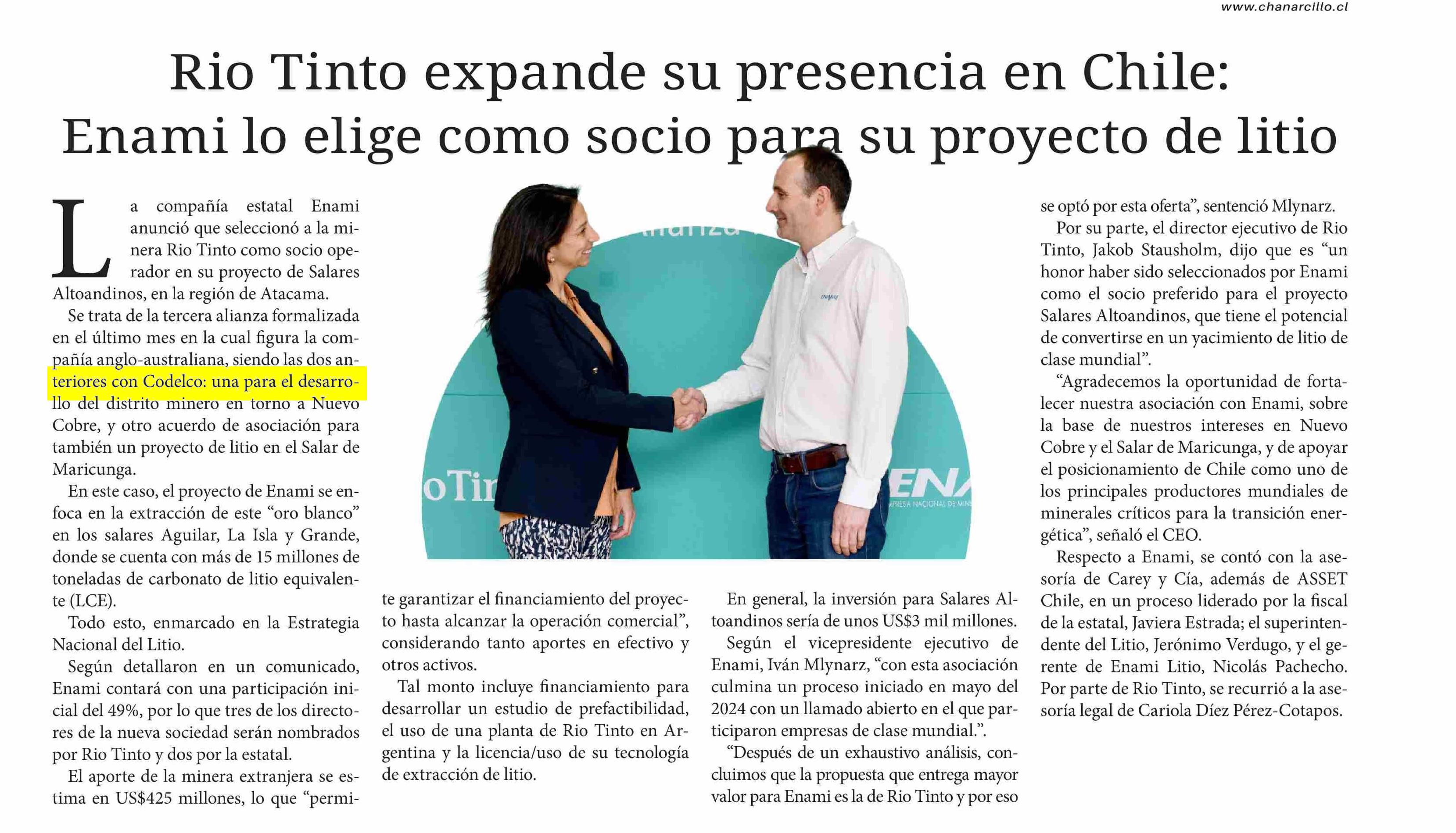 Rio Tinto expande su presencia en Chile: Enami lo elige como socio para su proyecto de litio