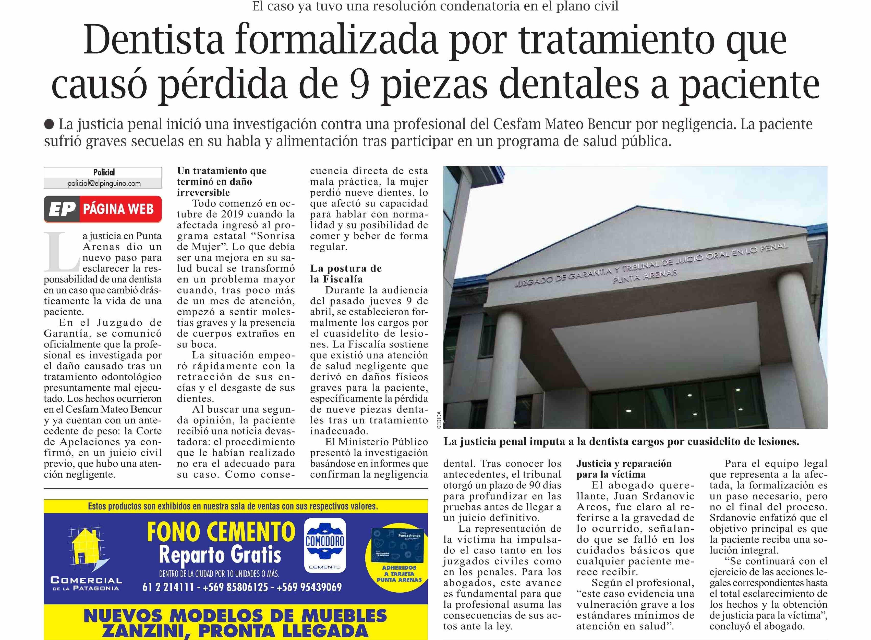 Dentista formalizada por tratamiento que causó pérdida de 9 piezas dentales a paciente