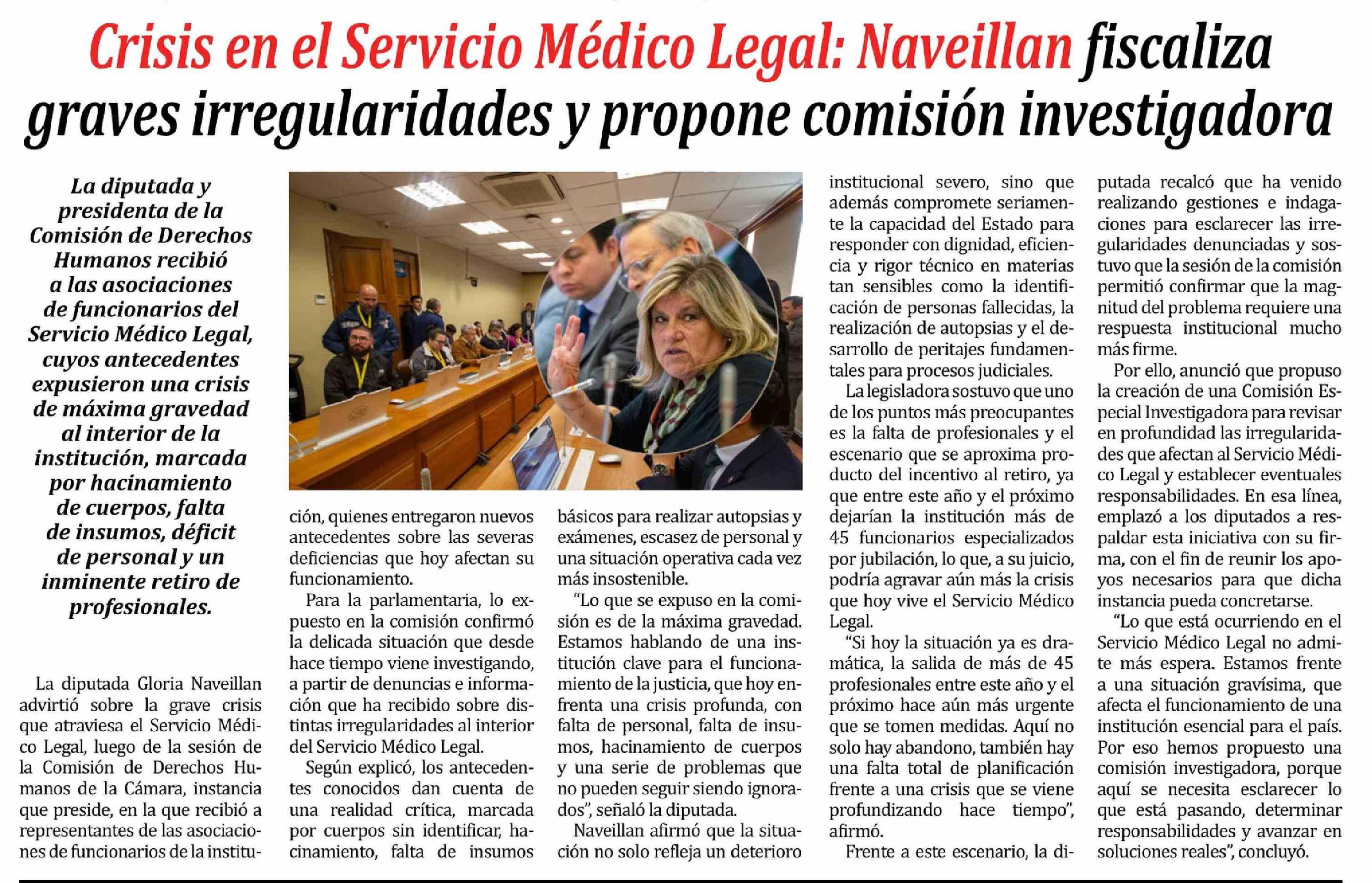 Crisis en el Servicio Médico Legal: Naveillan fiscaliza graves irregularidades y propone comisión investigadora