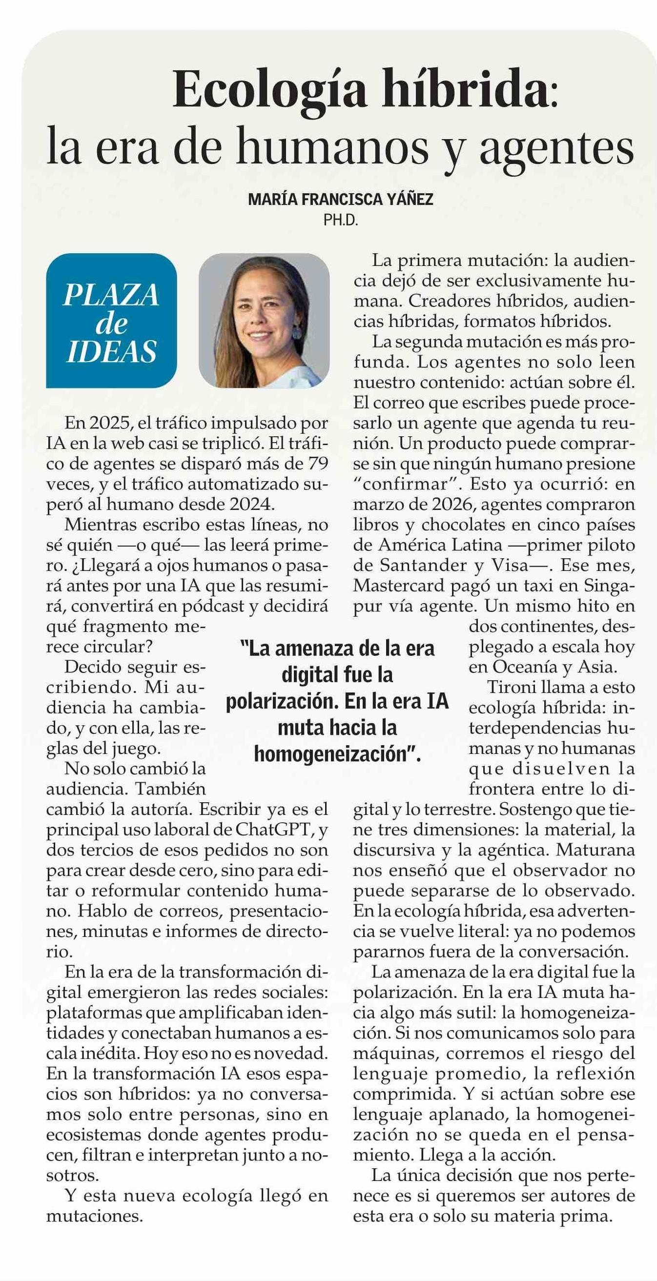COLUMNAS DE OPINIÓN: Ecología híbrida la era de humanos y agentes