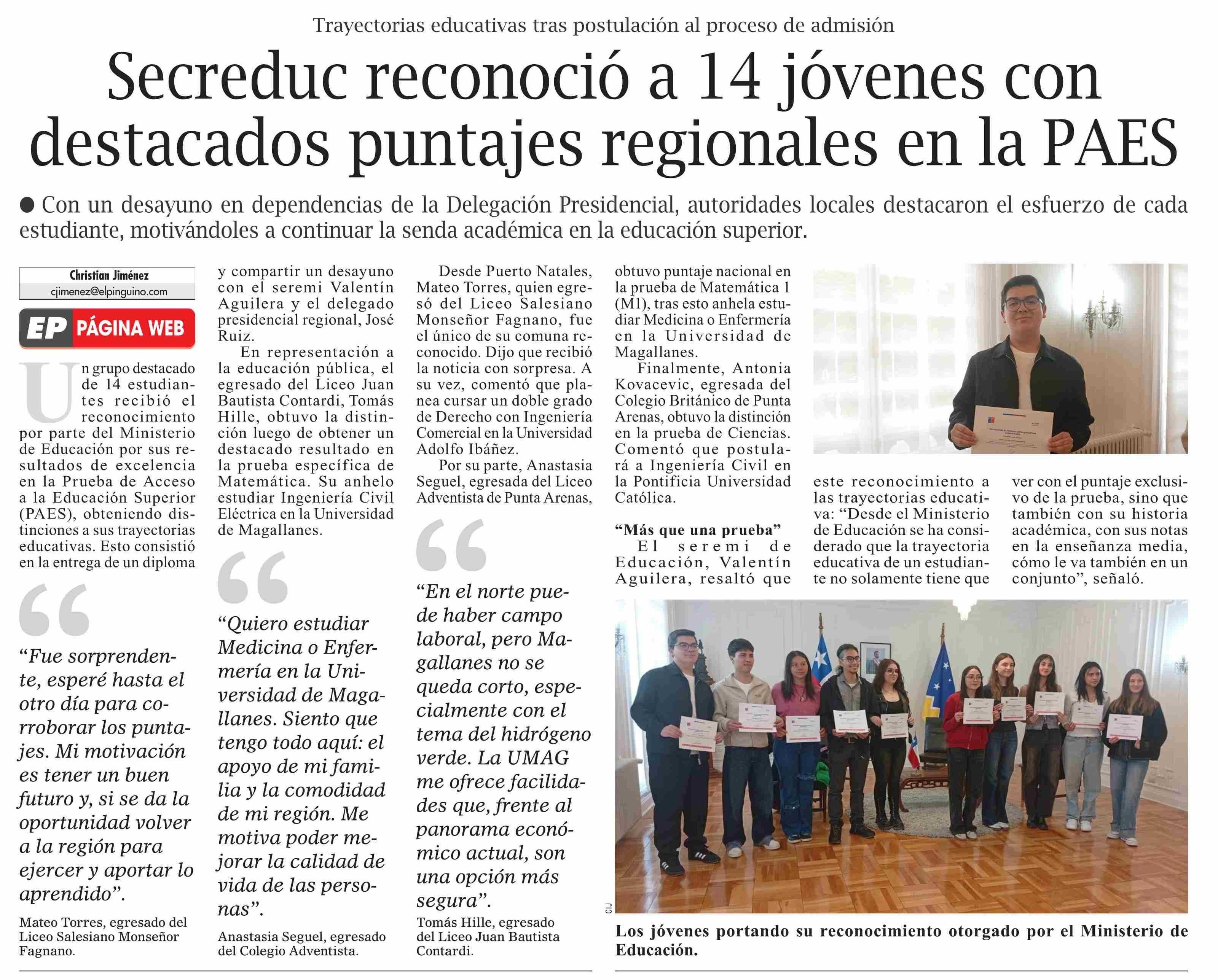 Secreduc reconoció a 14 jóvenes con destacados puntajes regionales en la PAES