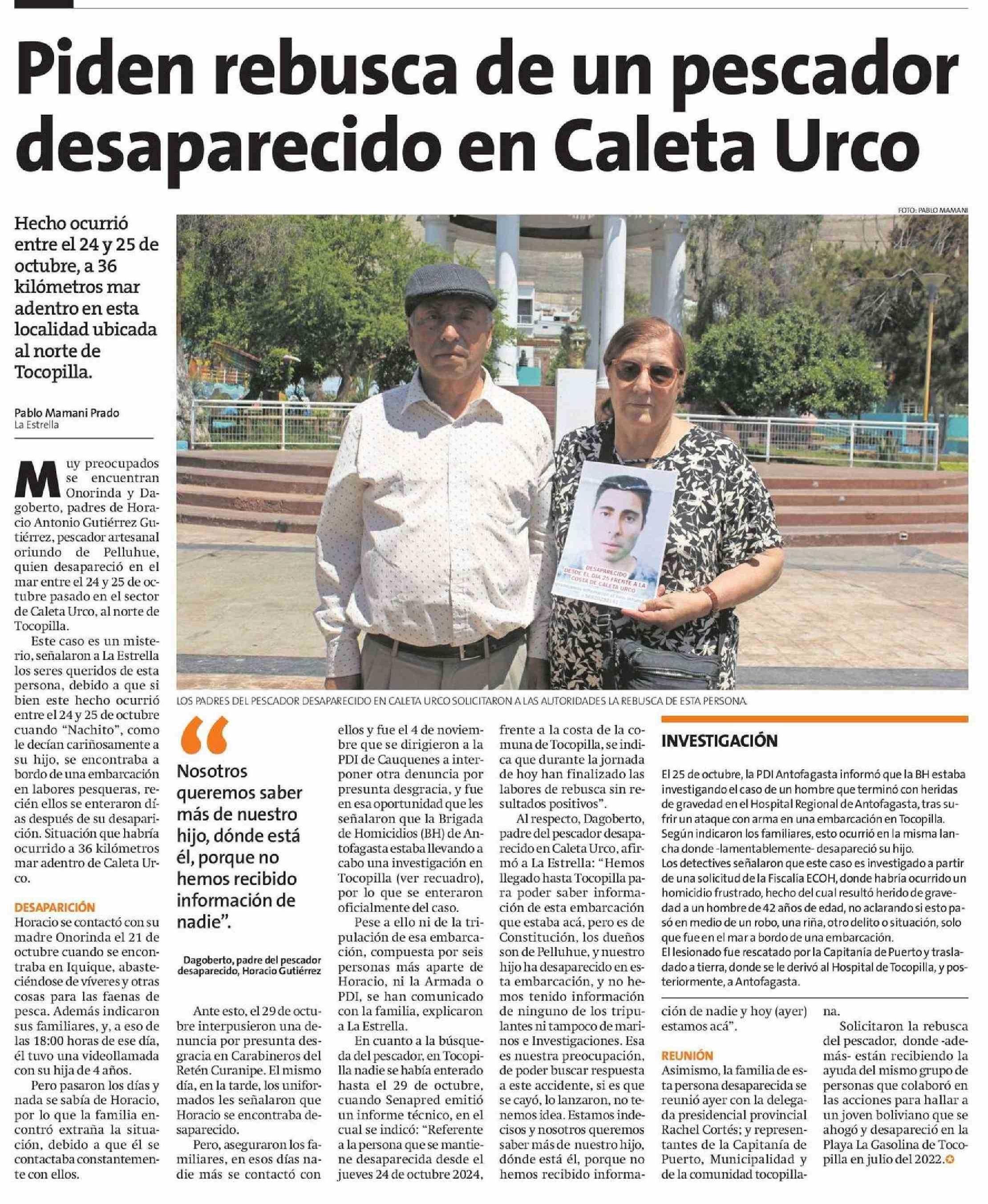 Iden rebusca de un pescador esaparecido en Caleta Urco
