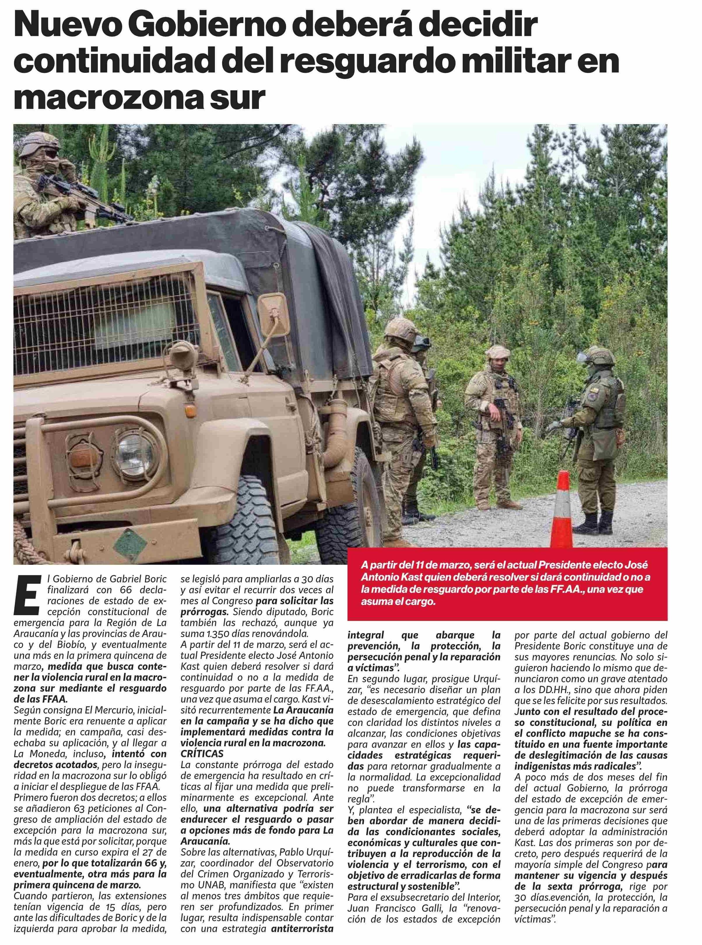 Nuevo Gobierno deberá decidir continuidad del resguardo militar en macrozona sur