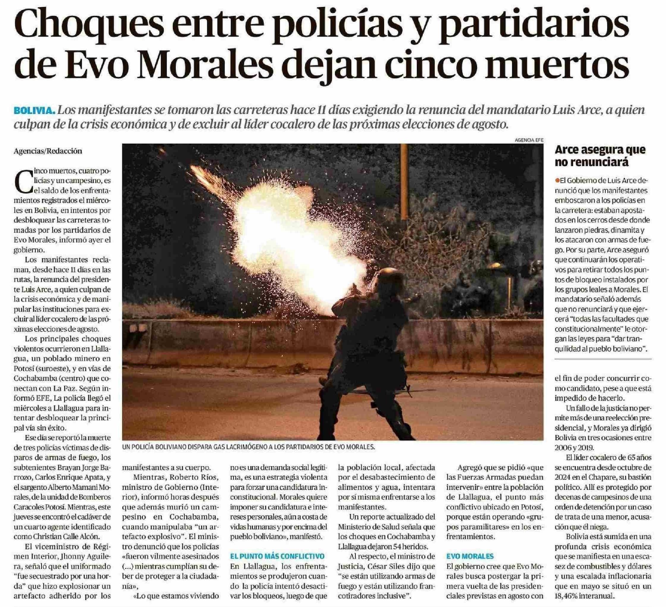 Choques entre policías y partidarios de Evo Morales dejan cinco muertos