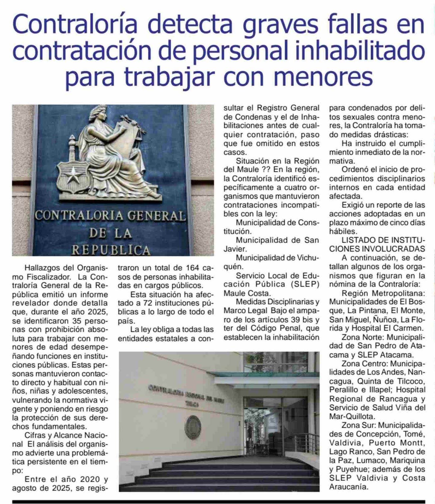Título: Contraloría detecta graves fallas en contratación de personal inhabilitado para trabajar con menores