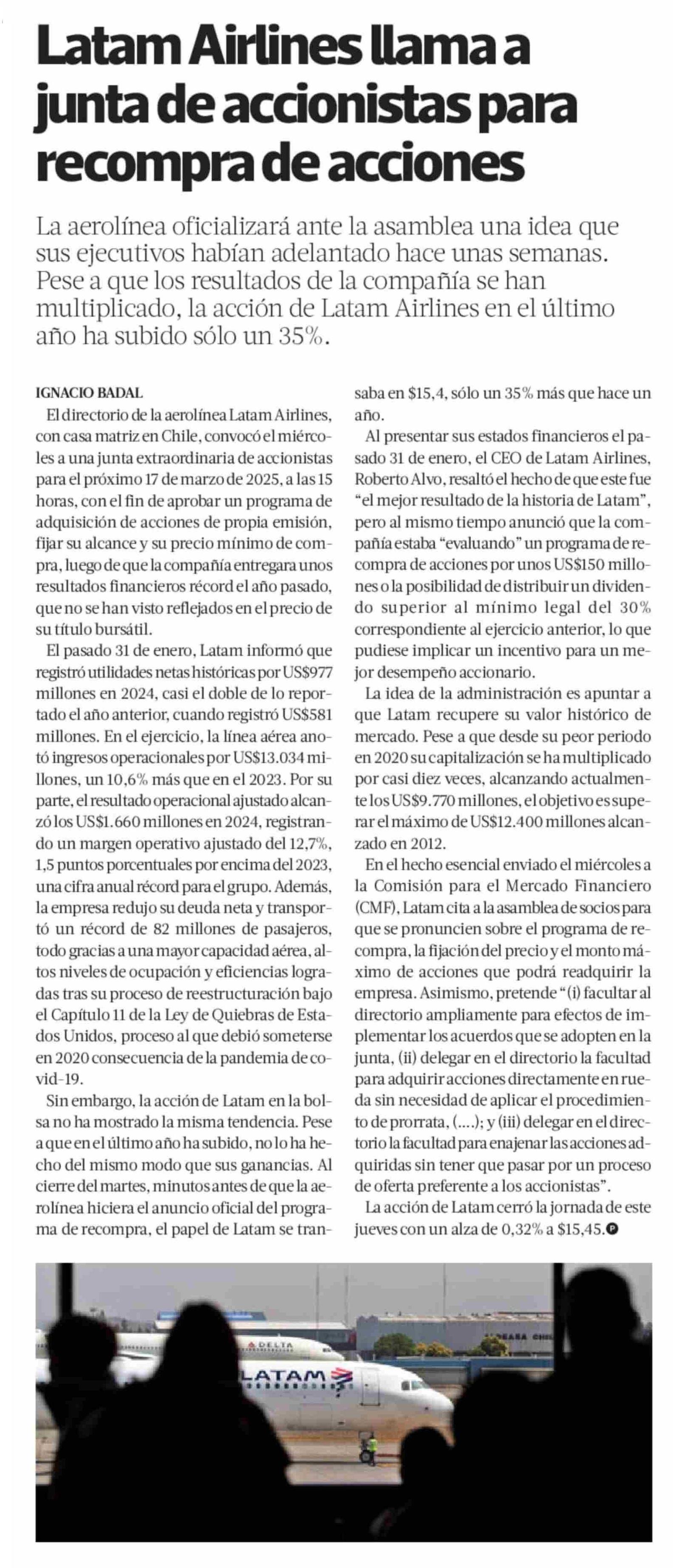 Latam Airlines llama a junta de accionistas para recompra de acciones