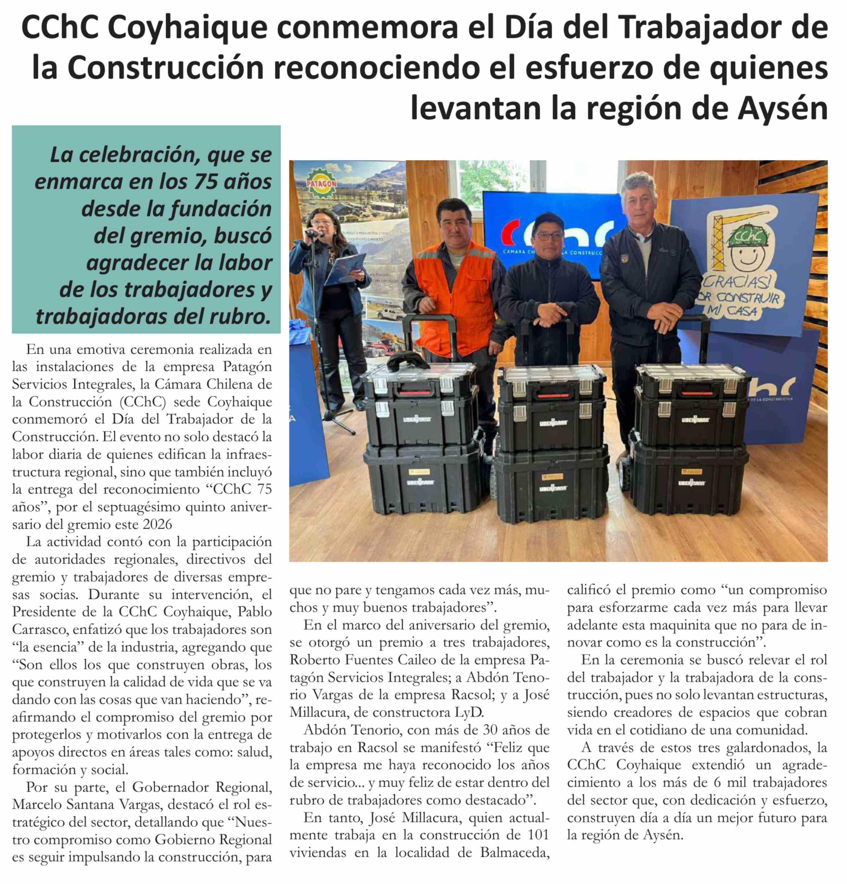 | Título: | CChC Coyhaique conmemora el Día del Trabajador de la Construcción reconociendo el esfuerzo de quienes levantan la región de Aysén |