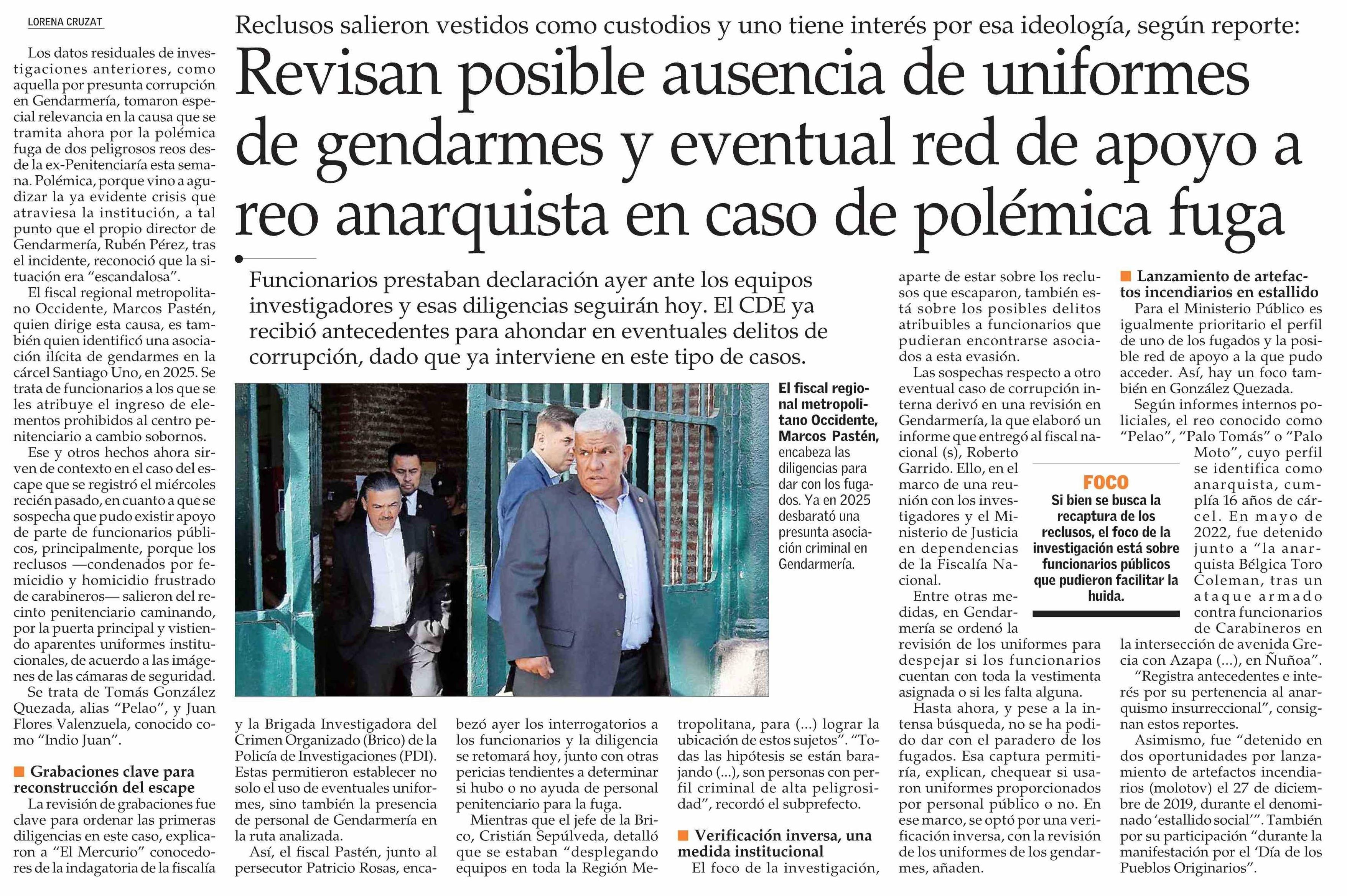 Revisan posible ausencia de uniformes de gendarmes y eventual red de apoyo a reo anarquista en caso de polémica fuga