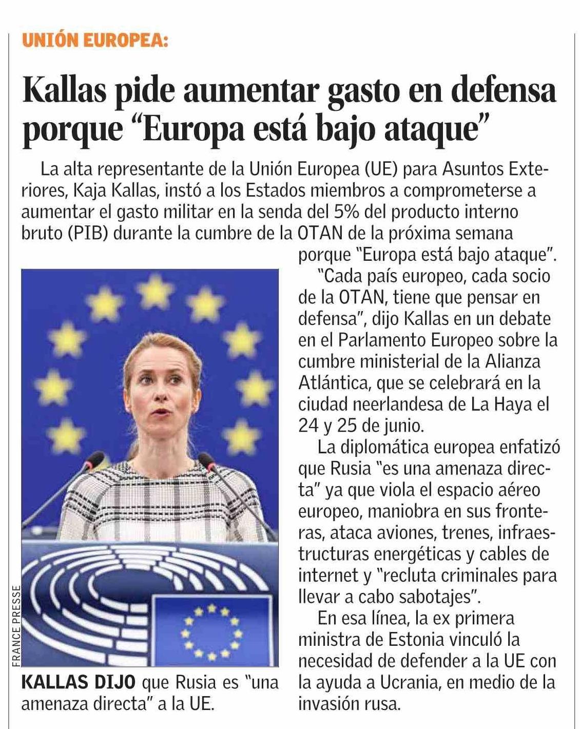 Kallas pide aumentar gasto en defensa porque "Europa está bajo ataque"