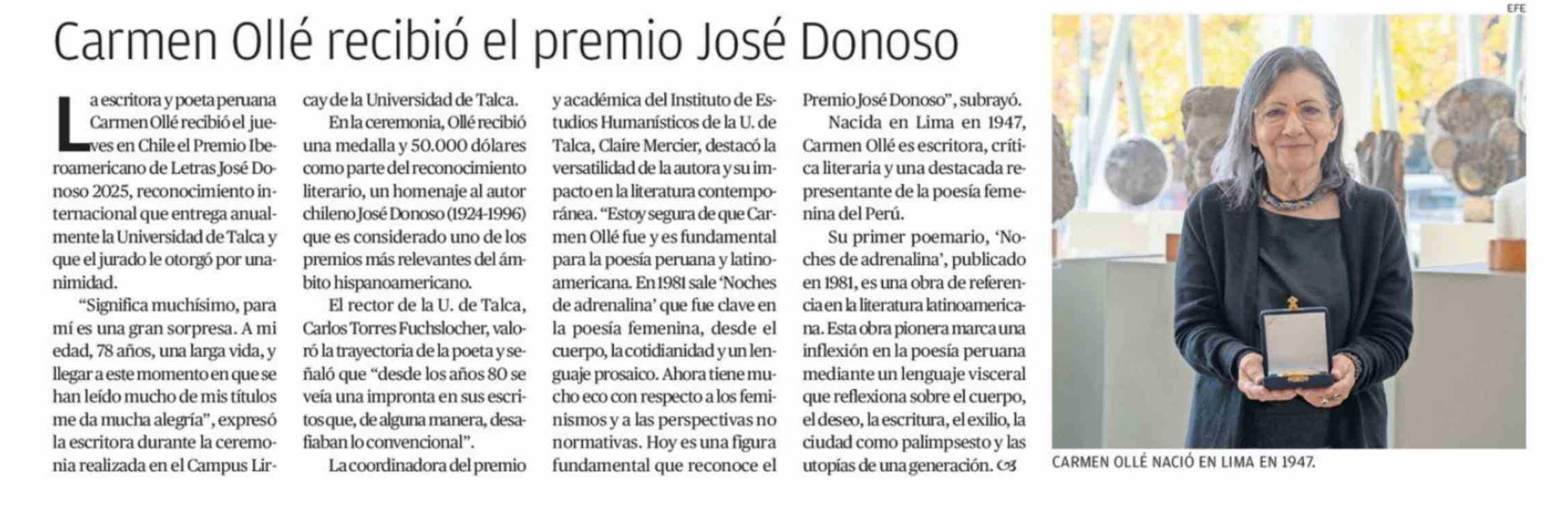 Carmen Ollé recibió el premio José Donoso