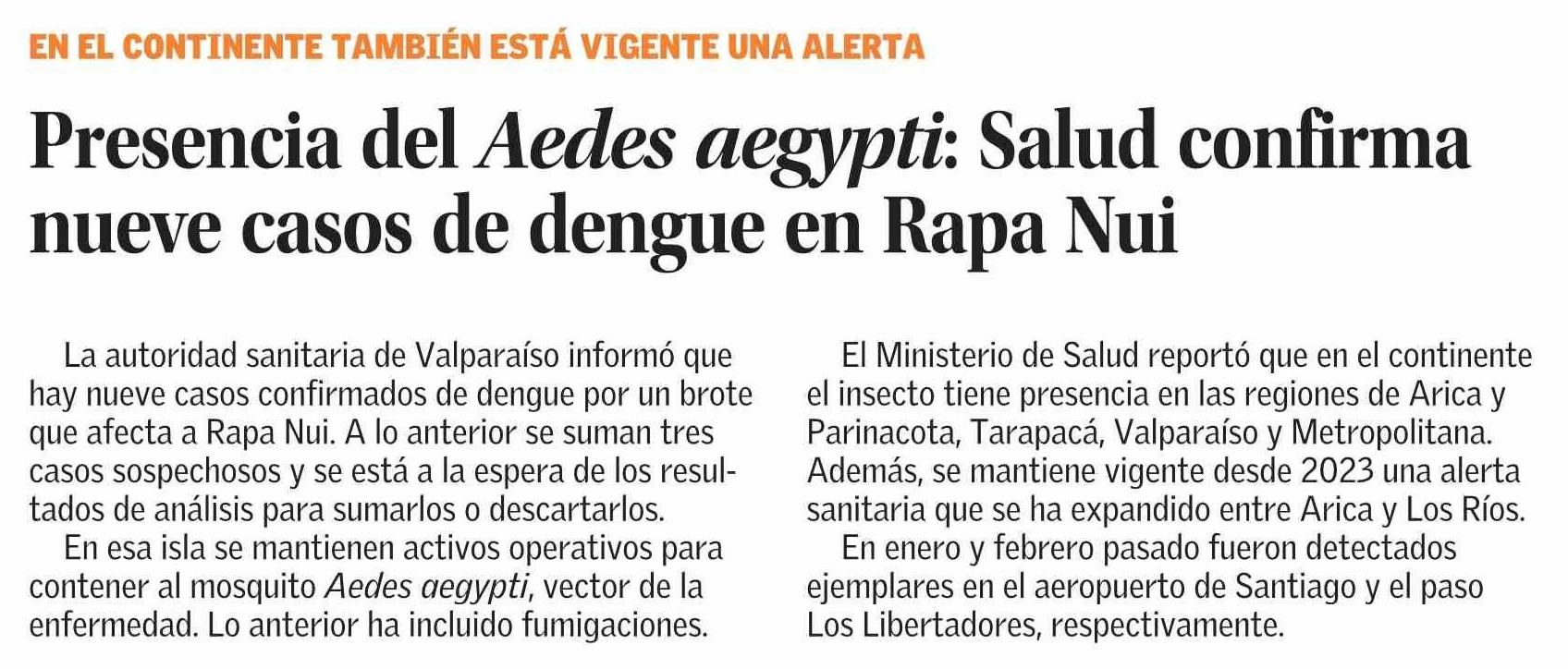Presencia del Aedes aegypti: Salud confirma nueve casos de dengue en Rapa Nui