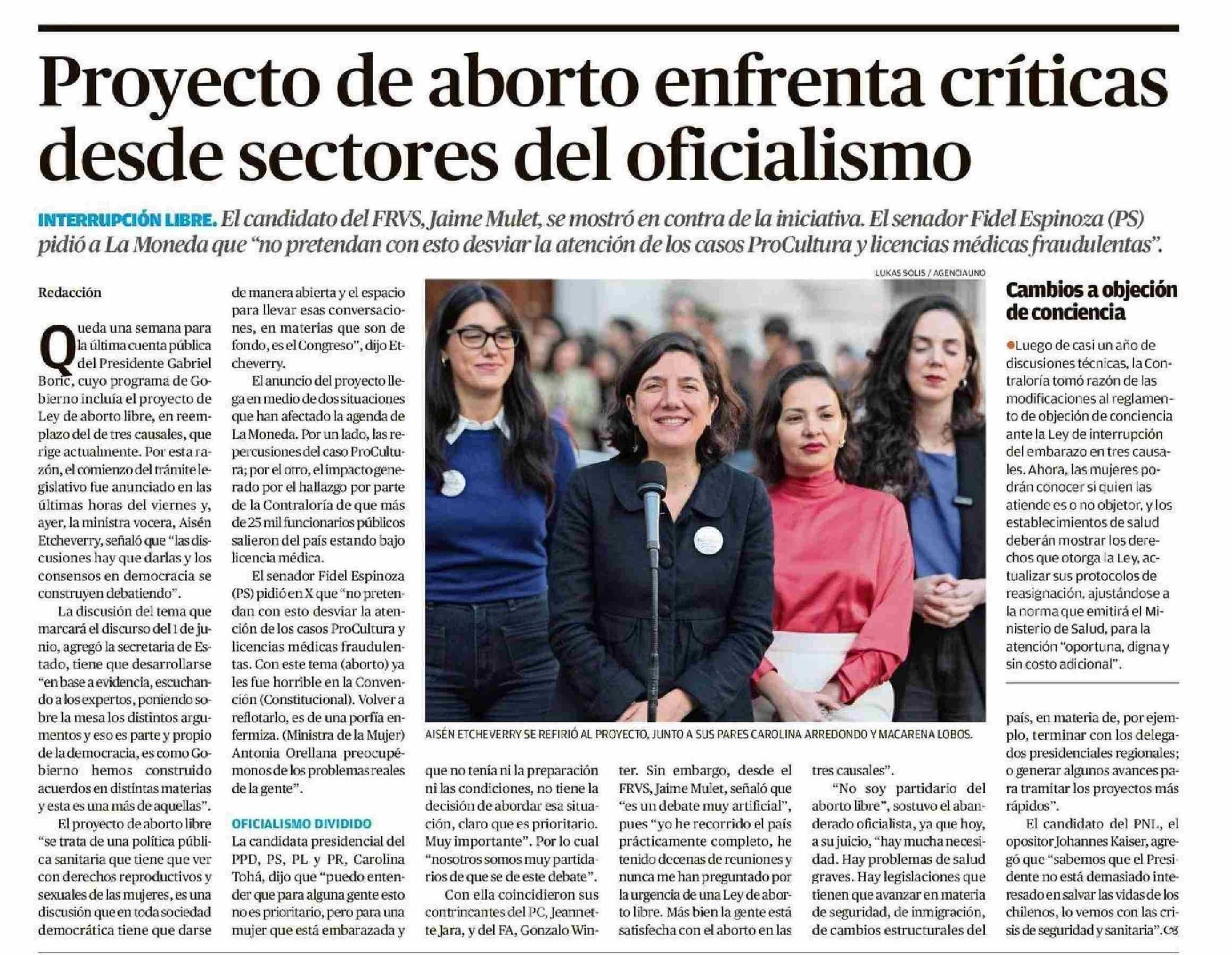 Proyecto de aborto enfrenta críticas desde sectores del oficialismo