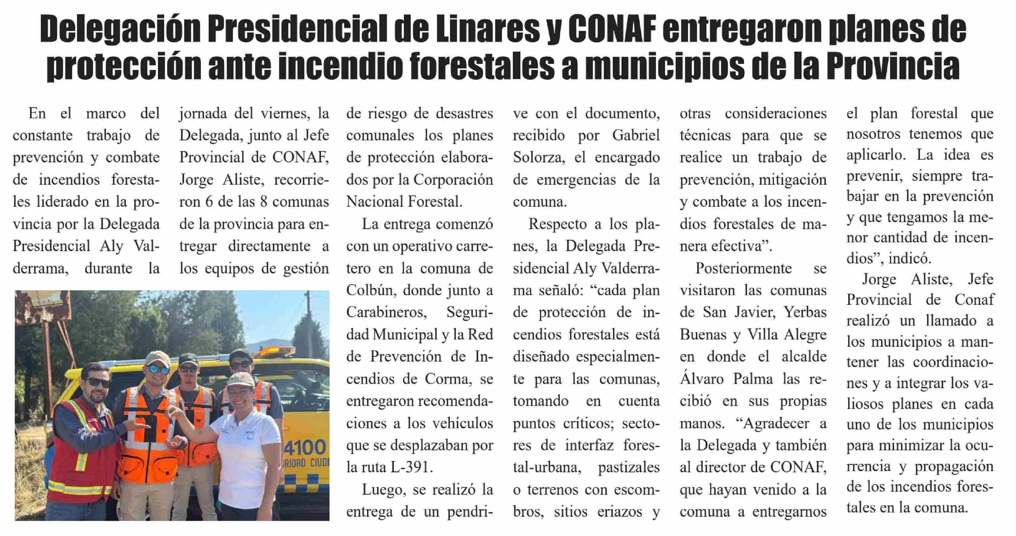 Delegación Presidencial de Linares y CONAF entregaron planes de protección ante incendio forestales a municipios de la Provincia