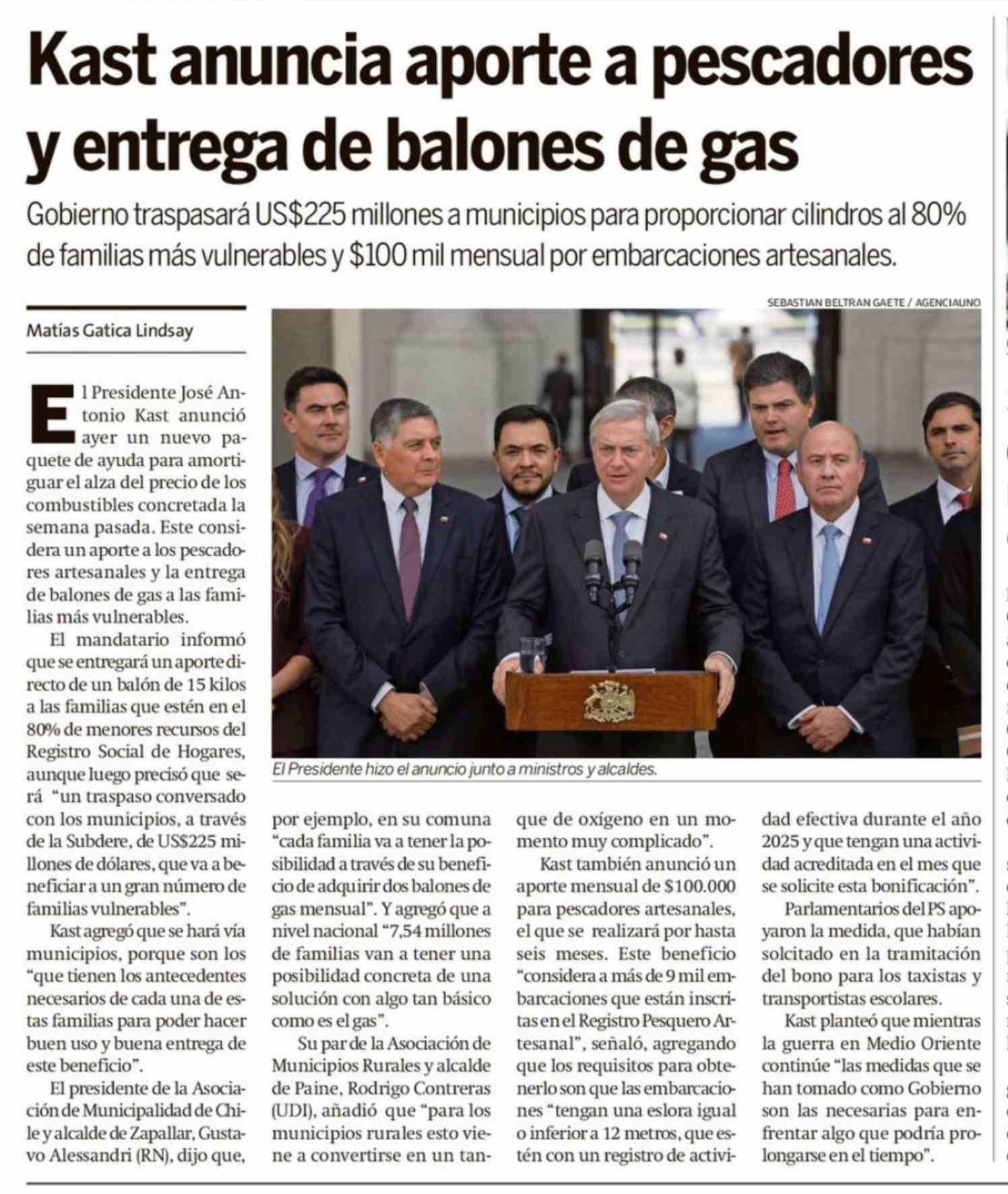 Kast anuncia aporte a pescadores y entrega de balones de gas