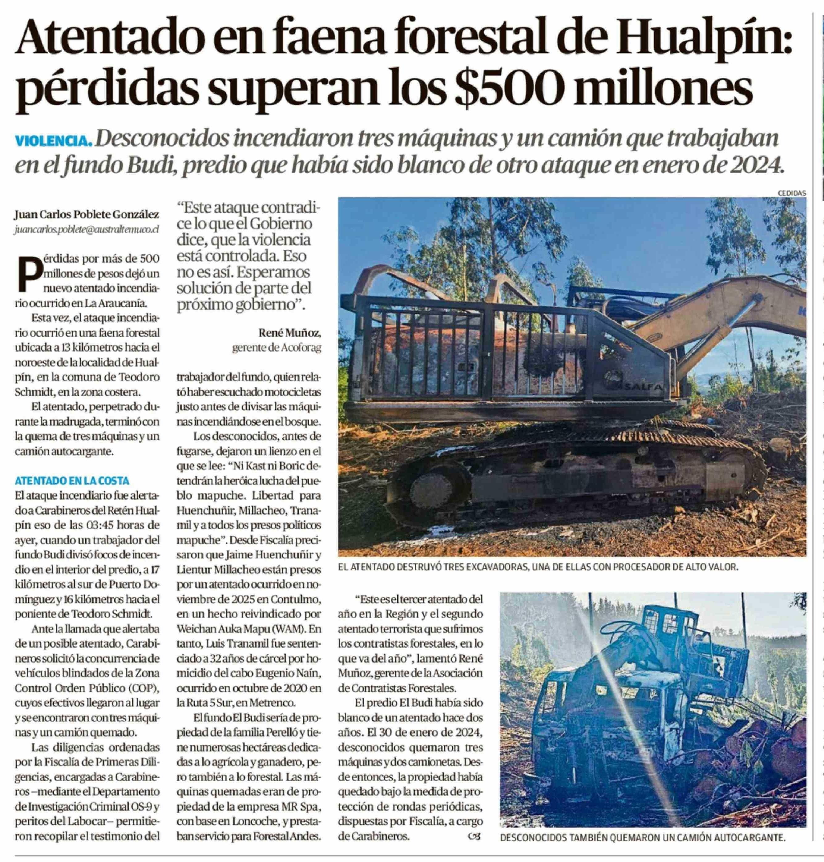 Atentado en faena forestal de Hualpín: pérdidas superan los $500 millones