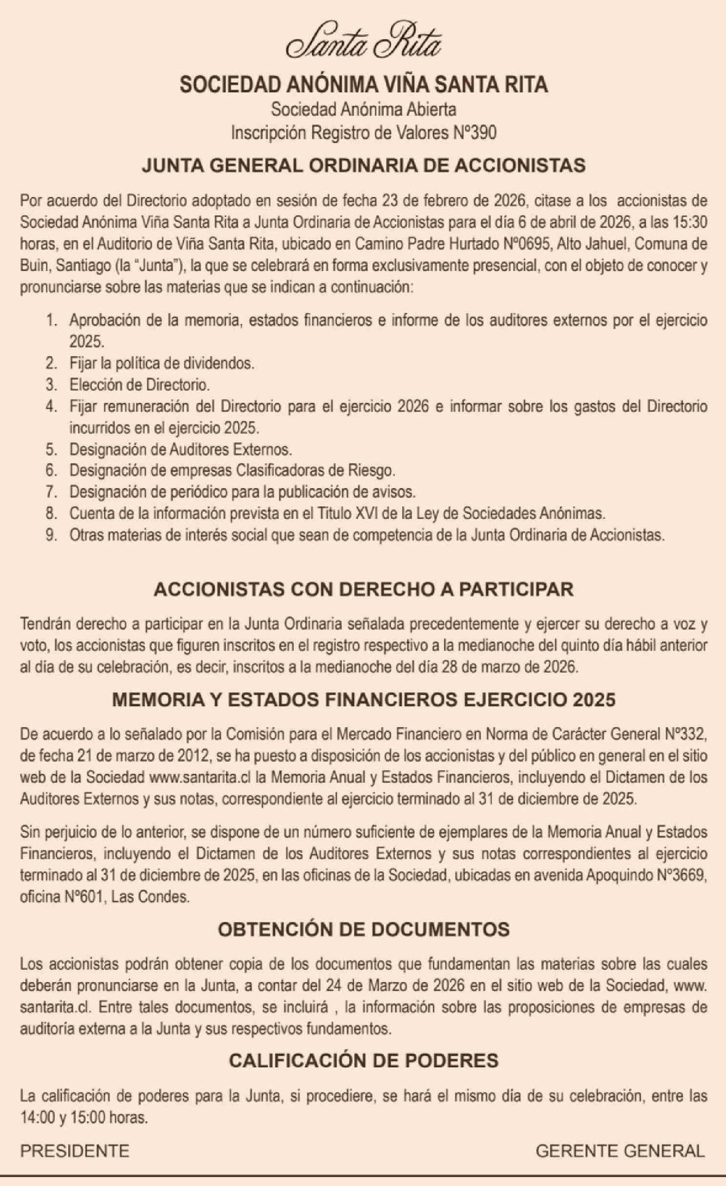 Extractos: SOCIEDAD ANÓNIMA VIÑA SANTA RITA