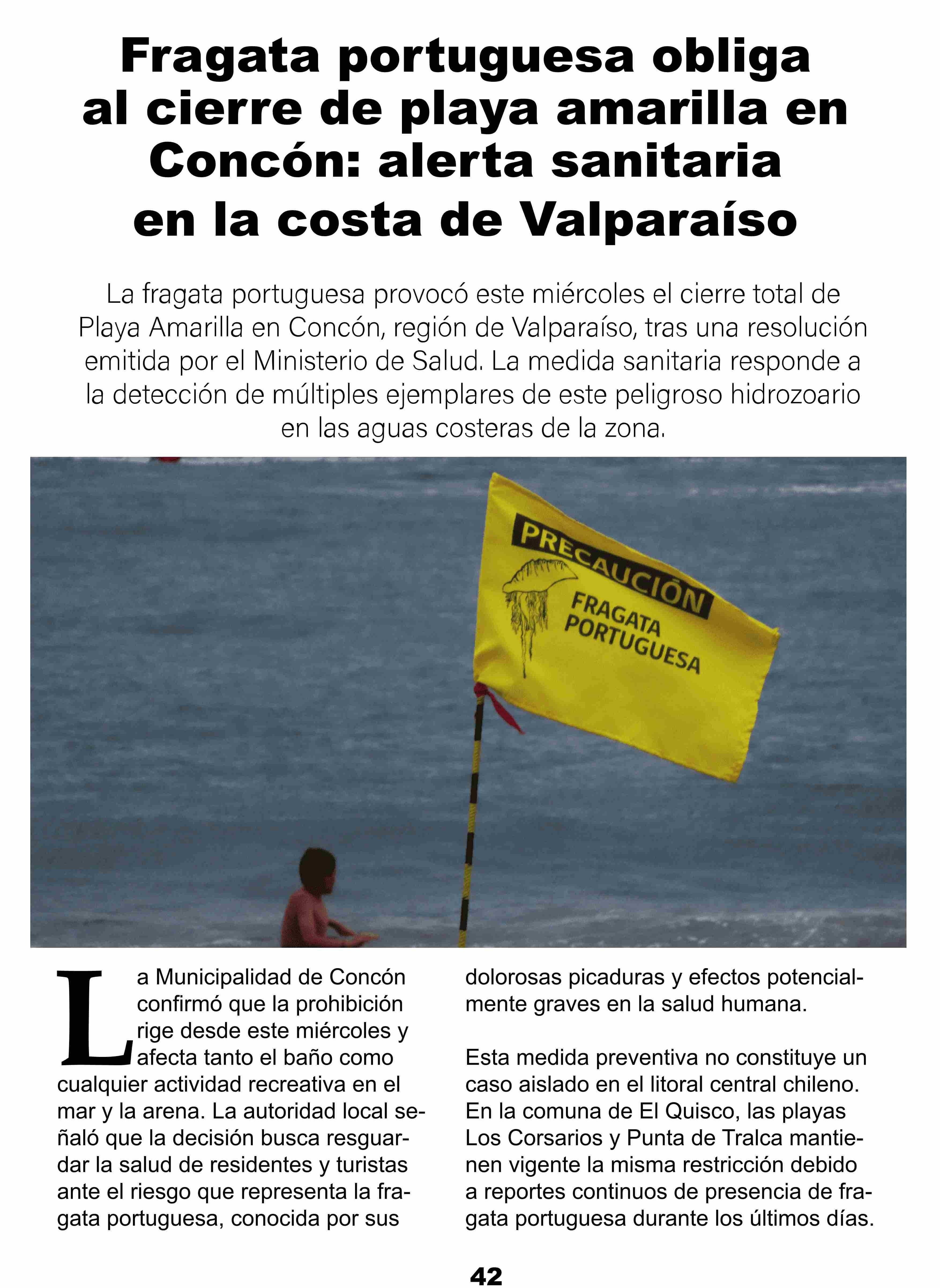 | Título: | Fragata portuguesa obliga al cierre de playa amarilla en Concón: alerta sanitaria en la costa de Valparaíso |