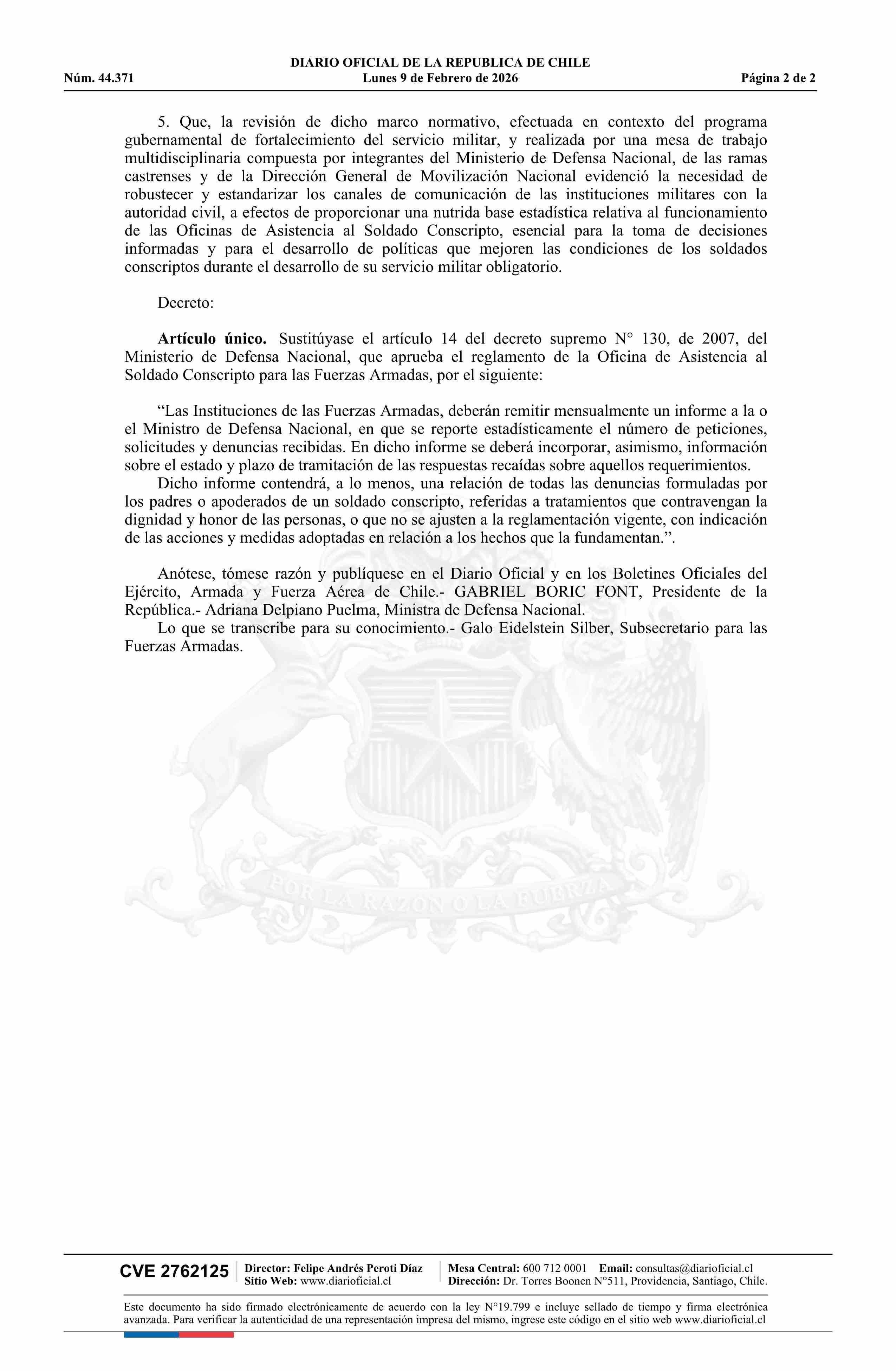 | Título: | Decreto número 188, de 2025.- Modifica decreto N° 130, de 2007, que aprueba Reglamento de la Oficina de Asistencia al Soldado Conscripto de las Fuerzas Armadas |